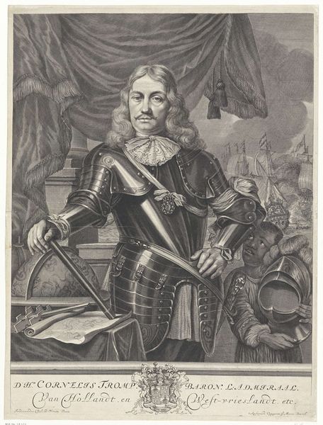 Curator: This engraving by Jan van Somer, dating from 1655 to 1700, presents a commanding portrait of Admiral Michiel de Ruyter. Editor: My immediate impression is of stern authority. The detailed armour and the rich blacks of the engraving exude power. You can sense the weight of responsibility in his posture. Curator: Indeed. De Ruyter was a significant figure in Dutch naval history, and portraits like these played a vital role in shaping and maintaining his public image. The setting with the globe and his coat of arms signifies dominance on global and national levels. How do you see it reflecting broader power dynamics of the era? Editor: Absolutely. It reflects a very masculine ideal – a kind of national heroism intertwined with colonial ambition. There is a tension in portraits of this type because there is the desire to honour the sitter, while simultaneously being bound by the rigid class and social conventions that shaped them. Note how De Ruyter appears against a backdrop that positions him as a key actor in the age of exploration and overseas expansion. Curator: Precisely. This portrait not only commemorates his individual achievements but also situates him within the context of Dutch maritime power. One can ask whether the glorification of a military figure in itself challenges pacifist interpretations of art history. Editor: And how it echoes into modern political and military discourse. Images such as this serve not just as a historical record, but also as a way of perpetuating national pride and perhaps obscuring some of the harsher realities of that history. Curator: Agreed. The visual rhetoric of strength and resolve clearly intends to cement De Ruyter’s place in the Dutch pantheon. Editor: And so it remains – a study in the power of portraiture and its ability to construct and reinforce historical narratives, but also to reflect social issues that are important for interpreting how people experienced that time period. Curator: This artwork definitely presents us a glimpse into the politics of imagery. Thank you for providing new ways to understand how social and political contexts influence portraiture.
