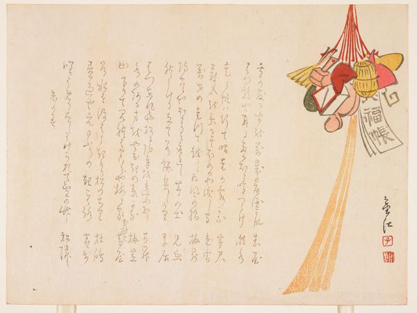 Editor: This is "Toy Tiger," thought to be from around 1854. It's a print, using ink on paper, by Iwao. The tiger has this stiff, almost geometric shape, which makes it look both playful and a little menacing. What do you see in this piece, beyond just a child's toy? Curator: Well, look at the tiger itself. What does a tiger typically symbolize in Japanese culture, and how is that challenged, or perhaps reinforced, by it being a toy? We see power, ferocity, but miniaturized, contained. Is this a way to domesticate the wild? Editor: That’s a fascinating thought. Like taming something inherently dangerous? Curator: Precisely! Think of ukiyo-e, the floating world, this piece’s category, and how often it grapples with ephemeral pleasures, theatre, and the like. A toy isn’t just an object, it's a condensed narrative. Also, what about the inscription beside the image? How does the written word influence the imagery, or vice versa? Editor: It looks like calligraphy… perhaps explaining or elaborating on the tiger's significance? So it adds another layer to this idea of controlled power through cultural memory? Curator: Absolutely. Each line, color, and symbolic association creates layers. Does the style remind you of anything? The simplified form, bold outlines… Editor: It feels very stylized, like folk art, almost like a paper cutout… bringing it back to the toy aspect again, I guess! Curator: Exactly! The simplicity reinforces accessibility and reminds us of childhood wonder, but also hides sophisticated commentaries. A toy holding centuries of symbolic weight… a powerful combination, wouldn’t you agree? Editor: I never would have considered it like that, that’s amazing. It gives me so much more to think about in other works, too!