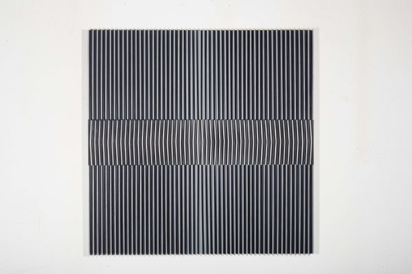 Curator: Before us we have Heinz Mack's "Licht-Relief", created in 1958. Mack, a prominent figure in Kinetic Art, fashioned this piece using metal to construct a captivating relief. Editor: Whoa. First impression? It’s like gazing into a high-tech waterfall—icy, sleek, yet somehow also organic in its texture. What’s the deal with kinetic art, anyway? Does it actually *move*? Curator: Not necessarily move, but certainly suggest it. Kinetic art explores movement or perceived movement. Here, the arrangement of lines catches and reflects light in a way that gives the illusion of motion, wouldn’t you agree? The light plays a critical role. The materiality speaks volumes, its form a stark arrangement of light-reflective structures. Editor: Totally! It’s like he’s sculpted light itself! The abstraction, plus the texture...it’s almost meditative. Reminds me of those ASMR videos with crinkling paper – a very satisfying visual rhythm. Do you think that's intentional? Curator: The intention, as with all art, is multifaceted and subject to interpretation. What is concrete, however, is its exploration into pure visual sensations using structured, geometric form. Abstraction became a vital means of communicating subjective truth for many artists during that time. The material properties offer a study into vertical linearity. Editor: Truth, huh? Maybe the truth that beauty can be found in even the most regimented structures. Kinda contradicts that “artistic freedom” trope, no? Curator: Freedom within limitations often yields more compelling results than total absence of structure. It highlights the intentionality in breaking free from limitations while showcasing an artist's proficiency within specific paradigms. Editor: True, true. A cage of our own making, beautifully gilded! Curator: Indeed. Mack’s “Licht-Relief” gives much for careful considerations, its deceptive simplicity invites extended interpretation. Editor: Okay, Heinz Mack, you’ve definitely bent my brain in a good way today.