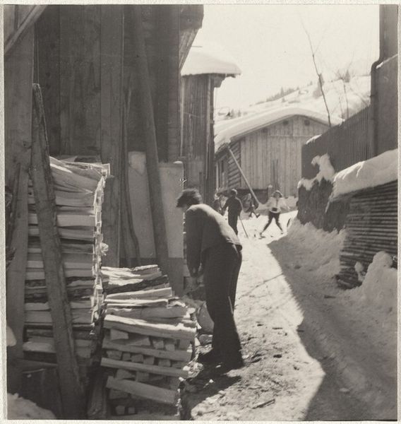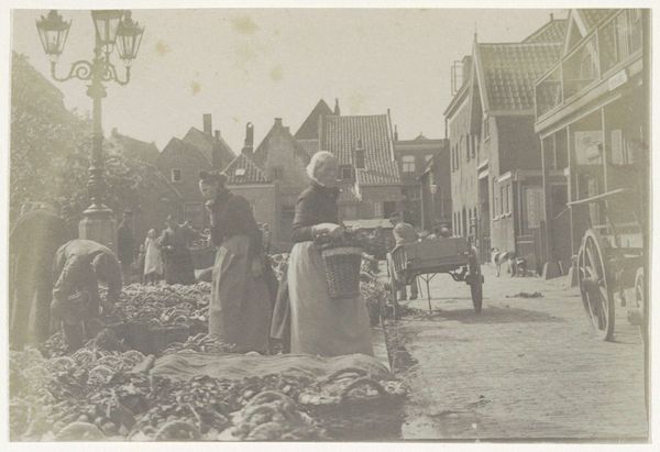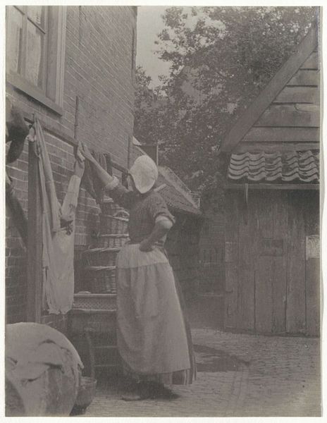 G. Hidderley captured this silver gelatin print titled 'Man in klederdracht staand naast stapels korven, vermoedelijk in Volendam', which translates to 'Man in traditional costume standing next to stacks of baskets, presumably in Volendam', likely in the late 19th or early 20th century. Here we see a man in traditional Dutch clothing standing in what appears to be a courtyard, surrounded by stacks of baskets. The image gives us insight into the traditional life and labor in Volendam. The man's traditional attire signifies a connection to cultural heritage, while the baskets hint at the labor-intensive industries such as fishing or agriculture which were common in the area. The photograph not only documents a specific time and place, but also speaks to the broader themes of identity, tradition, and the impact of modernity on traditional ways of life. The man seems to be caught in a moment of reflection, perhaps contemplating the changing world around him. In this way, the photograph serves as a poignant reflection on the preservation of culture amidst societal shifts.