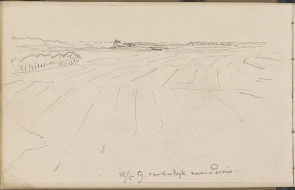 This is a landscape drawing of a field with trees by Albert Gottschalk. With delicate pencil strokes, the artist captures a muted scene. The composition is dominated by the curving lines of a ditch or canal, leading our eye into the distance. Sparse trees punctuate the horizon, while in the foreground, several vertical lines disrupt the landscape, which adds an element of tension. The drawing’s strength lies in its understated quality and its careful organization of space. Gottschalk’s marks create a semiotic system of signs, where each line and shadow contributes to the landscape's broader narrative. The horizontal lines of the fields contrast with the verticality of the trees, constructing a visual language that explores the interplay between nature and artistic representation. Notice how the simplicity of the medium and the subtle tonal variations do not merely depict a scene but also invite reflection on how we perceive and interpret our surroundings. It challenges our expectations, making us reconsider the relationship between art and the world.