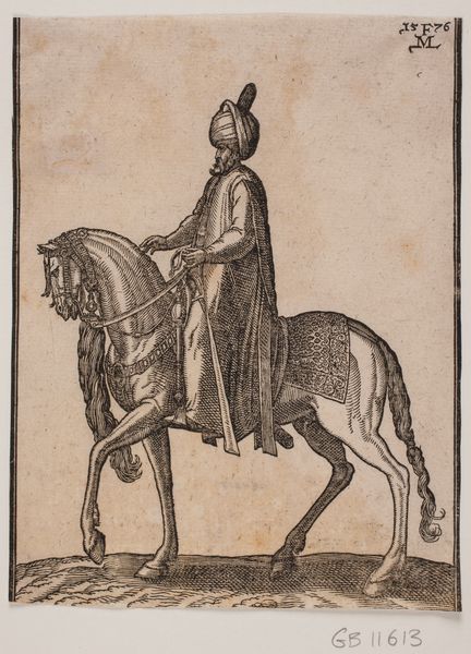 Curator: Let's explore "Bereden soldat, profil mod v.; lanse med vimpel, bue ved siden, cirkulært skjold, pilekogger; hovedbeklædning med fjerbusk" by Melchior Lorck, dating back to 1576. It's currently held at the SMK, Statens Museum for Kunst. Editor: Whoa, a seriously imposing figure! The textures are amazing for a woodcut. I am struck by the confidence of the horse and the soldier; it really leaps from the print, don’t you think? Curator: Absolutely. This engraving reveals layers of the Ottoman presence in 16th-century Europe, serving as visual documents of cultural encounter and the construction of identities in conflict and alliance. Editor: It’s strange, this figure both attracts and unsettles. What is this person defending and at what cost? The symmetry almost has a hypnotic effect, and there is a fragility due to it being rendered only in black and white. What do you think it all represents? Curator: Consider the details. Lorck, as a draughtsman and printmaker, navigated the complexities of representing “the other.” The artwork presents the subject according to very European aesthetic standards, thereby softening the threat perceived from the East, but it nevertheless contributes to the narrative around this geographical and ideological “border.” Editor: A border, both physical and imagined. The high level of detail is fascinating; the way the horse's tail has been crafted looks very painstaking and it brings the character to life in a way, despite it feeling so ancient. And those weapons! Curator: It's essential to reflect on Lorck's position within a network of political and cultural power. His depictions were not neutral, and the power dynamics influenced artistic and social reception of his art. Editor: I see this piece as an artifact—a reminder of the world as understood and portrayed during a time of significant change and cultural exchange. Curator: Exactly. This print invites us to consider the gaze—the historical gaze that produced it and our own gaze, centuries later, trying to interpret it through various different contemporary lenses. Editor: Agreed. And that feathered headpiece… I wonder what that was like in real life.
