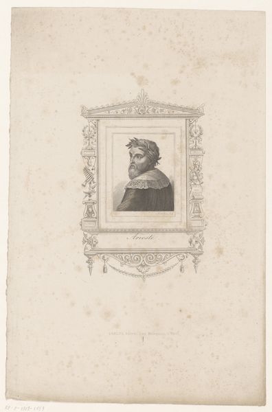 Curator: Here we have a print dating from between 1822 and 1870 by Charles-Ernest Clerget, titled "Portret van Rafaël in een versierde cartouche"—"Portrait of Raphael in an Ornamented Cartouche." Editor: The cartouche is lovely. So decorative. Almost over the top in contrast to Raphael's pretty chill expression, right? Curator: The artist places Raphael within this highly ornate framework, attempting to solidify his status within an established historical and artistic lineage. We must remember this piece was produced long after Raphael's death, fitting into an era that was intensely interested in idealizing the past and its great figures. Editor: Oh, idealized for sure! It makes me wonder, what *was* Raphael actually like? Beyond the legend, beyond the art history books? Did he have bad days? You know, did he spill paint on his clothes, argue with his assistants, get a crick in his neck from staring at the Sistine Chapel all day? This sanitized image airbrushes out any possible, human element. Curator: I agree, the portrait certainly seems geared towards creating an icon. Note, for instance, how the artist subtly uses the elements within the cartouche—a painter’s palette and brushes, for instance—as visual shorthands. This aims at cementing our understanding of Raphael’s legacy within artistic practice. Editor: That palette feels less like a symbol of a hardworking artist and more like an "artist" costume slapped on him after the fact. Look how neat everything is. Not a splodge of stray color! A pristine representation of what being an artist supposedly *means*. Which is maybe what the print *as a whole* is. Curator: Perhaps. From my perspective, the piece’s cultural value resides precisely in this desire to frame the artist, to situate artistic genius within a specific context. Editor: Right, context being everything. Even artificial constructs like this portrait tell a real story about the ongoing desire to understand greatness. To cage it or honor it, depending on how you look at it.