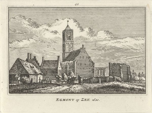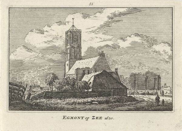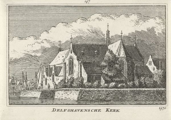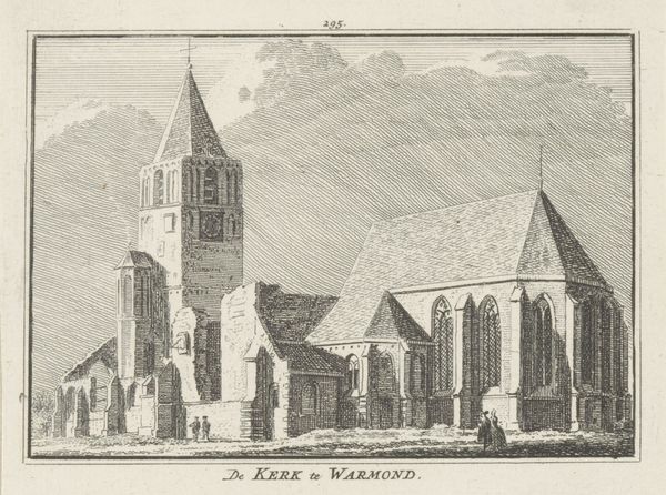 Editor: Here we have Abraham Rademaker's "Gezicht op de kerk te Warmond, 1650," a print created sometime between 1727 and 1733. The detail is amazing. What strikes me most is the line work used to create such texture. How do you see the artistry in this piece? Curator: What captivates me here is the sophisticated interplay of line and tone, especially considering this is an engraving. Notice how the artist uses varying densities of hatching to evoke a sense of volume and light. What structural elements stand out? Editor: I see how the verticality of the church tower contrasts with the horizontal landscape. The eye is drawn upwards, but the composition keeps it grounded. Curator: Precisely. The composition achieves a satisfying balance, further enhanced by the strategic placement of the clouds. Consider how the linearity almost borders on abstraction; Rademaker isn't merely representing reality but is actively constructing a visual experience. Are you also intrigued by the contrast of textures, rough versus smooth? Editor: Definitely. The rough, broken textures in the walls really makes the steeple seem clean. How do you see that playing into Dutch realism? Curator: Realism isn't solely about mimetic representation; it's also about engaging with the material qualities of the world. Look at how the texture isn't applied everywhere, though. Note how smooth it is, for example, along the bottom bank that it reflects in the canal. How do those features guide your eye? Editor: I had missed that! So it uses the line work to divide it between a sense of realness and art. Curator: Exactly. It asks, "what are the rules and limits of art," which for me is the great draw of formal analysis: technique can be art itself. Editor: It's a fascinating lens! Thanks for pointing out things I completely overlooked.