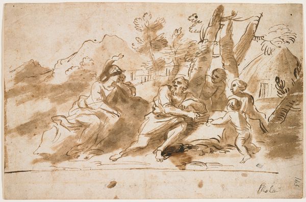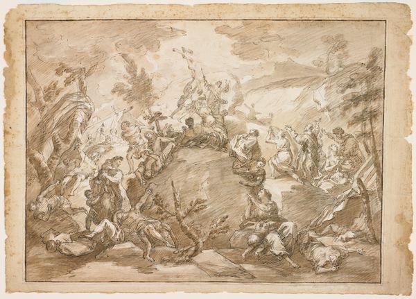 Curator: What a brutal scene! I immediately sense an urgency and suppressed violence bubbling beneath the surface of this ink drawing. The earth tones heighten that rawness for me. Editor: This is "The Stoning of Saint Stephen" by Niccolo Bambini, created between 1697 and 1703. Note how Bambini harnesses the dynamism of Baroque style, even in this relatively small drawing on paper, now held at the Metropolitan Museum. Curator: Yes, there's certainly a powerful Baroque energy present! Notice how Stephen is bathed in a softer light compared to the muscular figures looming over him, actively raising rocks for the execution. Editor: The halos certainly direct our eyes, yet that structural interplay of shadow and light – the tenebrism – is a powerful tool, heightening the drama. The entire composition leads to Stephen: an artful use of perspective. Curator: The halo is interesting, acting as a cultural shorthand to depict holiness, as if we collectively agreed on how saints look; like a brand we automatically recognize. And the physical postures! They really amplify that sense of impending doom for Stephen. Look at the arching backs, the strain on those limbs... Violence feels intrinsic. Editor: It’s also worth considering how line and form achieve narrative here. The jagged contours, rendered in ink, capture not just movement but a textural discordance - the roughness of the stones, the contorted bodies. Each stroke builds an image steeped in physical and emotional torment. Curator: Precisely! Consider how such depictions affect cultural memory and behavior over time, embedding violence in our shared visual vocabulary. Images teach, reinforce, and sometimes desensitize us. Editor: True, and Bambini leverages recognizable artistic languages here: using composition and symbolic cues. It allows for narratives and shared understandings. An image designed not just to be viewed, but read, decoded, and emotionally responded to. Curator: Exactly, like looking into a dark mirror, a visceral reminder of what humanity is capable of, and how symbolism is vital to carrying it from generation to generation. Editor: Indeed. A deeply considered drawing of the Baroque style. A testament to the formal devices artists use, allowing powerful themes to resonate for centuries.