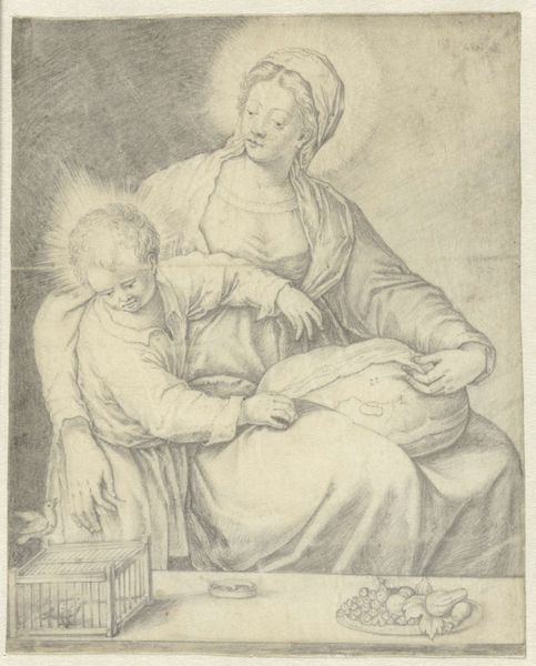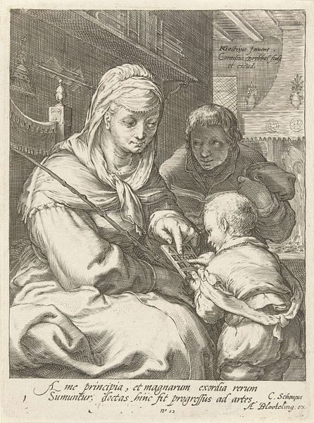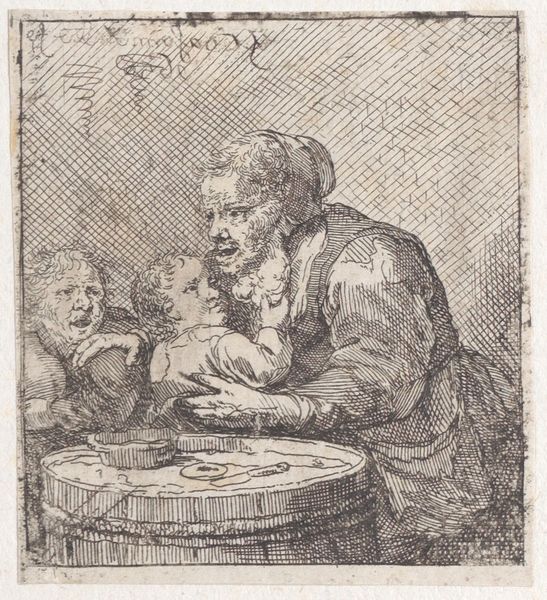 Editor: This is "An old woman holding a glass and a piece of paper, a child at left and a man behind her at right", an etching by Jacques Dassonville, made sometime between 1635 and 1675. I’m struck by how intimate and detailed it is, despite being a relatively small print. What catches your eye? Curator: The composition, while seemingly casual, is meticulously constructed. Note the subtle interplay of diagonals, from the child’s gaze upwards to the man behind the old woman, which create a dynamic movement across the picture plane. Editor: So it’s not just a simple snapshot, then? I initially thought it felt very natural, like a scene from daily life. Curator: Consider how the artist employs line. The density of the hatching varies greatly to simulate form and shadow, particularly in the folds of the clothing. Where is your attention drawn because of this? Editor: Definitely to the old woman. Her face is so expressive, and the glass she’s holding catches the light. Also the way the cross-hatching behind her gives depth and darkness to the piece as a whole. Does the paper she's holding give you any thoughts? Curator: It's a compositional element, mirroring the bright and subtle textures elsewhere. Observe how Dassonville balances light and shadow through his intricate use of line. Editor: It’s amazing how much detail he achieves with just lines! Curator: Precisely! And it’s through this detail that the work transcends a mere genre scene. The artist compels us to engage in a formal dialogue with his creation, prompting reflection. Editor: I see what you mean. I was so focused on the narrative; I missed the underlying structure and artistic choices. Thank you! Curator: Likewise, reflecting on this print reveals nuances previously unseen, reinforcing my appreciation for the power of formal analysis.