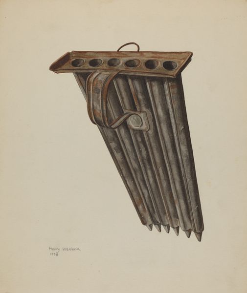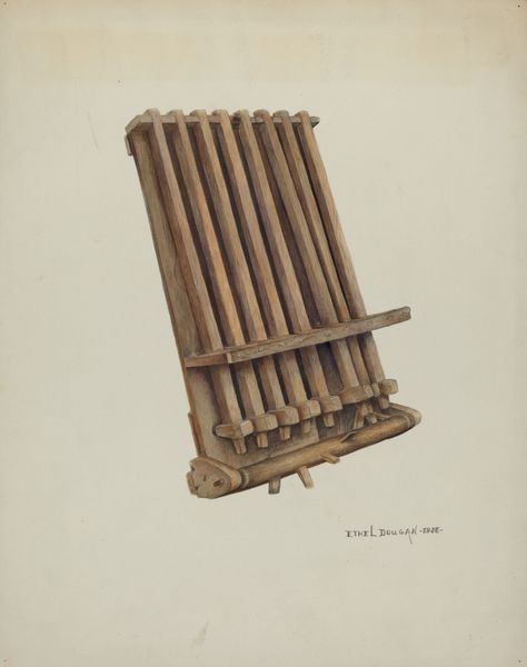 Editor: This is H. Langden Brown’s "Comb (For Horses' Manes and Tails)," circa 1938. It’s a colored-pencil and wood drawing. The composition, with its stark simplicity, almost makes me consider this ordinary object in an abstract context, devoid of utility. What do you see in this piece from a formalist point of view? Curator: The deliberate rendering of form immediately strikes me. Observe how the artist utilizes coloured-pencil to meticulously capture the grain of the wood. The rhythmic repetition of the comb's teeth creates a captivating visual cadence, wouldn’t you agree? It’s less about function and more about exploring the relationships between line, shape, and texture. Editor: I see that now, especially with how the empty spaces between the teeth add to this rhythm you're pointing out. Are there any other aspects of its composition that are noteworthy? Curator: Certainly. Consider the crest of the comb—its curvilinear design contrasts against the rigid, linear elements below. This tension engages the eye, forcing it to reconcile opposing forces. It avoids pure functionality, transforming a utilitarian object into an aesthetic study. What thoughts does that provoke? Editor: That contrast makes me think of the blending of artistry and function. Thanks to this perspective, I’m thinking about the aesthetic impact of functional objects. Curator: Exactly! Examining the work devoid of exterior knowledge enables us to assess its basic properties. It reminds us to not take simple forms for granted.