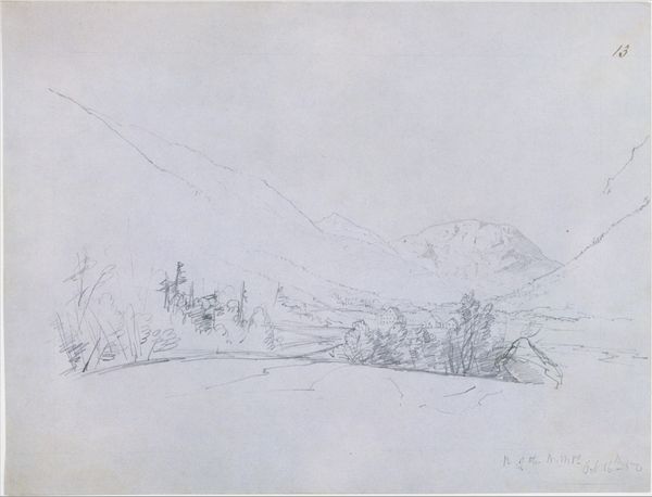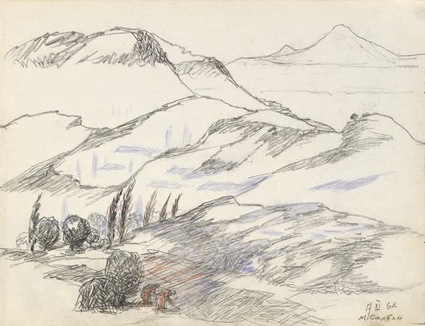 Curator: This delicate watercolor is Paul Cézanne's "View of Mont Sainte-Victoire," currently residing at the Harvard Art Museums. Editor: It feels like a half-remembered dream, a landscape barely held together by the faintest of lines. Curator: The mountain, so central to Cézanne's later work, becomes here almost a ghost, a fleeting presence. Perhaps it represents a yearning or the weight of memory itself? Editor: Or perhaps it's simply the artist grappling with form, the planes of color barely hinting at the solid geometry to come. Note how he treats the mountain and the trees in the same manner. Curator: Yes, and observe how the motif of Sainte-Victoire echoes through his oeuvre, almost like a personal myth or an enduring symbol of his Provençal identity. Editor: Ultimately, for me, the unfinished quality is what speaks most profoundly. It's a beautiful example of process made visible. Curator: I agree. It reveals the enduring power of place on the artist's psyche.