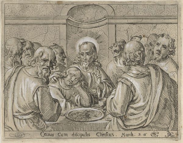 Curator: Before us, we have "The Last Supper; The last supper with Christ sitting in the center embracing John", an engraving by Marcantonio Raimondi, dating from 1495 to 1539. Editor: My immediate impression is one of incredible intimacy rendered through a rather stark, almost architectural, linework. There's a quiet tension hanging in the air. Curator: Indeed, the detailed engraving, done in print, is compelling. The artist skillfully manipulates line and tone to create depth, and what is most interesting is that the work showcases Italian Renaissance aesthetics translated via the relatively new printmaking technologies available at the time. It reflects an interest in democratizing art production. Editor: I think the placement of John, leaning affectionately against Christ, disrupts any illusion of egalitarianism that might have been implied. I’d say, through a postcolonial lens, this positioning, with its emphasis on intimacy and betrayal, also exposes an internal conflict within a tightly-knit group—the seeds of its future undoing. It begs the question, what narratives are favored, and whose voices are further marginalized in this depiction? Curator: Perhaps the focus is less about inclusion and more about production, focusing instead on a visual product generated for a specific, consuming audience that engaged in visual culture. The texture of each garment, the way light catches on the metallic jugs and plates, even the act of reproducing this image using mass printing, creates access to the story of the Last Supper through tactile and sensory detail. It is a very process-driven work, showcasing that the creation of images has changed irrevocably and that the impact is immediate. Editor: Agreed, there’s an undoubtable intimacy offered, and an undeniably gendered subtext worth questioning within the image itself. That is precisely what makes this engraving, and similar works of that time, continue to offer much to chew on today. Curator: It reminds me to contemplate both how art can serve both as propaganda and artistic investigation and production at once. Editor: Absolutely, and considering its subject matter, let us always reconsider not just the who, what, when and where, but more crucially, the why, from a historical and sociopolitical perspective.