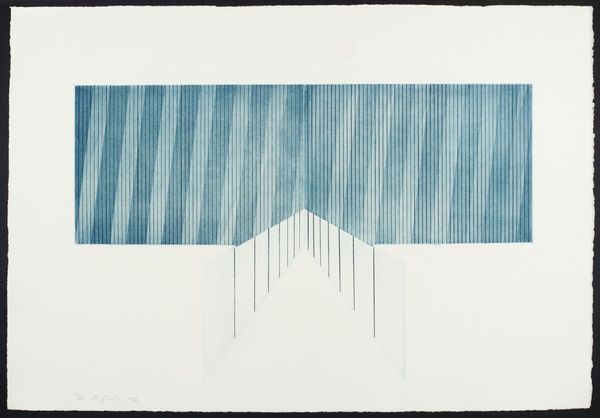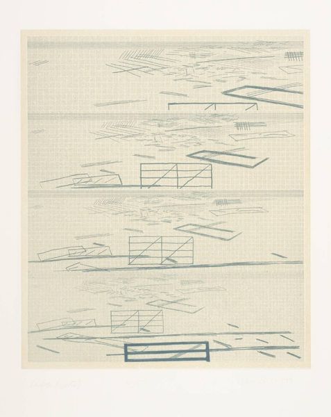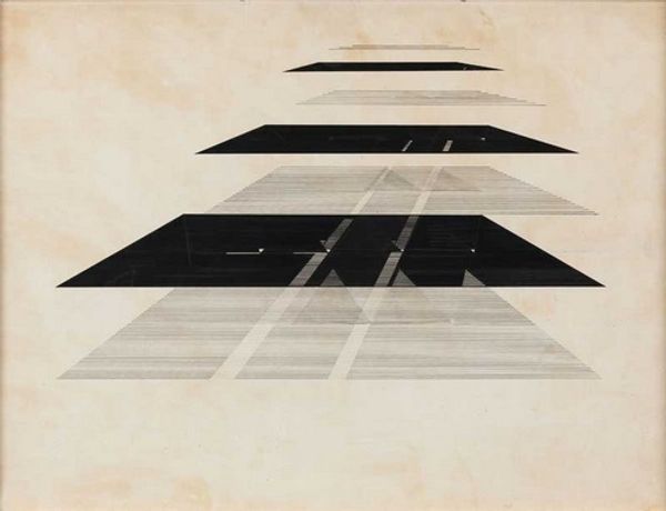 Curator: This is an Untitled graphite drawing from 1980 by Nasreen Mohamedi. Editor: It’s strangely serene. The delicate lines and geometric shapes seem to float against that grid background, like an architectural plan for… emptiness. Curator: Mohamedi’s work often reflects the socio-political climate of her time. Her minimalist approach can be interpreted as a subtle act of resistance against the dominant artistic trends in India during the 1980s, which heavily favored narrative and figuration. This quiet abstraction becomes a powerful statement. Editor: That underlying grid gives everything such order. Look at the repeated shapes, those stacked circles which create the suggestion of cones… I wonder about those forms as mandalas or stupas, hinting at spiritual seeking. It is fascinating how modern abstraction can resonate with very ancient, familiar symbols. Curator: It’s also vital to acknowledge Mohamedi's identity as a woman practicing abstraction within a male-dominated art world. Her unwavering focus on pure form and line, devoid of overt emotional display, challenges conventional notions of feminine expression and defies expectations placed on women artists. Editor: Do you think that limited palette of graphite adds to that defiance? The grayscale makes the symbolism more nuanced and open to interpretation, more psychological and subtle rather than declarative. The lack of color doesn't make it emotionally neutral, but rather amplifies feelings, especially isolation and contemplation. Curator: Precisely. This rigorous adherence to line and form can also be viewed through the lens of postcolonial discourse, challenging the exoticized expectations projected onto artists from the global south. Mohamedi consciously resisted such projections. Editor: What I initially took as emptiness now feels full. It has shifted from an abandoned building plan into an introspective view, reflecting the artist’s mind. I had not seen such rich associations with minimalist form before. Curator: Her work invites us to deconstruct binaries and preconceived notions, highlighting the agency of artists in shaping their own narratives within complex historical contexts. Editor: The careful orchestration of horizontal and vertical lines suggests a quiet balance that I certainly overlooked initially. The negative space between these fine lines feels charged with untold narratives.