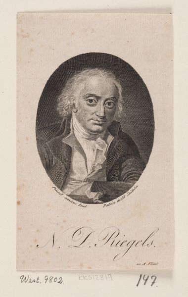 Editor: Here we have a print, an etching actually, by J.F. Clemens, depicting Joh. H. Wessel, active between 1748 and 1831. I'm immediately struck by the incredible detail achieved in this monochromatic portrait, especially the textures. What do you see when you look at it? Curator: It's fascinating how Clemens employs a strategic arrangement of line and shadow to create volume and texture within the graphic space. Notice the density of the hatching used to model Wessel's face and clothing, versus the relatively blank area serving as the background. How does this interplay of dark and light affect the perception of depth and form? Editor: It makes him pop out of the background. All those tiny lines give the illusion of three-dimensionality, even though it’s flat. What’s the significance of the linear patterns of his clothing? Curator: The repetitive lines forming the sitter’s attire not only simulate the texture of the garment but also draw the eye toward the focal point – the portrait’s visage. The eye travels upward. Observe the circular gesture implied by the scarf’s knot at his neck. Editor: Oh, I see that now! That looping is a great touch. It does keep me locked on the portrait's face. Thanks, I wouldn't have caught that on my own. Curator: Precisely, art is not solely about what we see, but how our eyes and minds make interconnections. Analyzing visual elements provides great value and deeper appreciation.