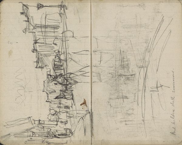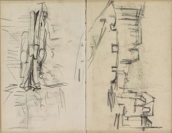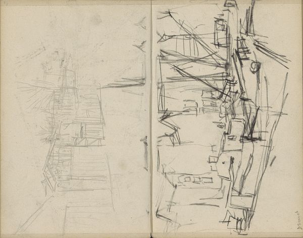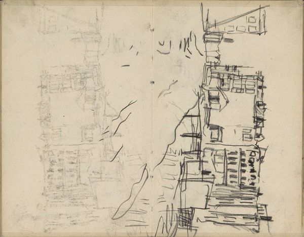 Editor: This is “Twee gezichten op het Damrak te Amsterdam,” or “Two views of the Damrak in Amsterdam,” a graphite drawing made around 1903 by George Hendrik Breitner. I'm immediately struck by the starkness of it – the almost brutal, raw energy in these lines. What captures your attention when you look at this piece? Curator: It’s the immediacy that grabs me, you know? It feels like Breitner was right there, sketchbook in hand, capturing a fleeting impression of Amsterdam. This isn't a polished cityscape; it's a raw, unfiltered moment. It's less about the buildings themselves, and more about the feeling of the city – the hustle, the bustle, the raw energy. Doesn’t it make you wonder what the street smelt like that day? The sounds? Editor: Definitely, it feels very 'in the moment,' not at all staged. I can almost hear the clatter of the city. The composition is unusual though, isn't it? Almost two separate sketches fighting for space. Curator: Precisely. He’s exploring, juxtaposing perspectives. It's almost as if he couldn't decide which view he wanted to capture, so he just did both. It reminds me of a visual diary. Think about that – he's not trying to create a masterpiece, he’s trying to capture a memory. What I find super interesting is, even though it’s just graphite, the density of the marks conveys such a vibrant sense of atmosphere, almost as if he's inviting us to feel the weight of the city. Editor: That’s a cool way to put it. It's amazing how much information and feeling he can convey with such simple means. It almost feels like he’s daring you to fill in the gaps. Curator: Exactly! He offers you the bare bones, and trusts you to bring your own experiences to the table. It's like a collaboration between artist and viewer, across time. I guess what’s so appealing, for me at least, is this quiet intimacy, the fleeting nature of it all. A beautiful little snapshot in time, preserved on paper. Editor: I see what you mean. Now, looking at it again, it does feel more personal and engaging, like a shared experience rather than just a depiction.