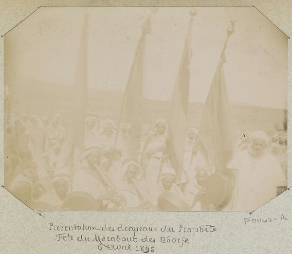 This photograph by Marotte captures a ‘Fête du Marabout’ near Chorfa, Algeria. The image, likely a gelatin silver print, shows a gathering of men seated in a field. The tonal range of the photographic print is central to its effect. The sepia tones flatten the field, creating a sense of immense scale as the crowd recedes into the distance. The act of photography itself, a relatively new technology at the time, plays a role here. The camera transforms a social event into a commodity, an object of study and consumption for a European audience. Consider the labor involved, not only in the event itself, but also in the making of the photograph: the photographer's work in capturing the image, the darkroom processes, and the eventual distribution. This highlights how photography, even in its early days, was deeply intertwined with social observation, documentation, and the developing landscape of colonial consumption.
