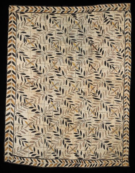 Curator: I find myself drawn to the repeating patterns on this textile piece; it’s got a hypnotic, meditative quality, almost like a visual mantra. Editor: Exactly! The "Panel" we’re observing dates back to the 19th or 20th century and originates from the Kuba people. The textile artwork utilizes both dyed raffia palm fibers, and can be seen at the Minneapolis Institute of Art. Curator: Kuba textiles often strike me as a conversation between structure and improvisation. Do you feel the interplay of geometric shapes suggests certain societal principles? Editor: Without a doubt. Geometry provides a shared language for the culture's visual expressions of complex cosmological principles. The arrangement, repetition and variation signify hierarchy and power, maybe even life’s unfolding challenges, as it can evoke cultural narratives and genealogical links too. The symbols transmit values and reinforce Kuba’s complex societal fabric. Curator: So, far beyond pure decoration, these forms encode meaning, a history woven, or rather sewn into the very fabric, and you can literally feel its rich texture! There is something primal and reassuringly balanced with its compositions. Editor: I wonder how the original artist felt, painstakingly creating this, generation after generation, by unknown artisans using techniques perfected over time? A certain feeling of devotion certainly arises here... Curator: Yes, something about it touches on both the universal desire for harmony and the beauty of a very specific cultural vision. Editor: So true, the image remains timeless.