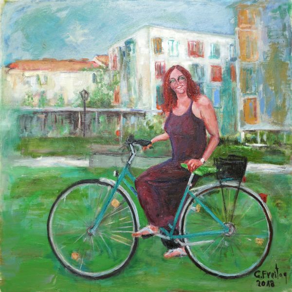 Curator: Zoe Hawk's 2020 oil painting, "The Chariot," is striking. It shows a young woman with her bicycle flanked by two cats in what appears to be a quiet neighborhood. What captures your attention first? Editor: Immediately, I’m drawn to the dress—the stars are so dominant. It’s intensely American but feels deliberately naive. There's an almost propagandistic vibe, yet…dreamy. Curator: You know, the stars, for me, evoke more personal narratives, almost a celestial mapping of her journey. Dresses, in her work, often are codes, visual signifiers about transformation and interior worlds. The bicycle? What stories does that tell you? Editor: A bit clichéd, but a machine for freedom? I sense constraint too, because the cats are literally blocking her chariot’s path. Those cats! The stark dichotomy of black and white... good and evil, night and day... maybe she is frozen on the edge of something unknown. Curator: Ah, but are they obstacles? The black cat is traditionally mysterious and perhaps represents hidden parts of the self, or destiny even; while the white is seen pureness or innocence, Maybe they're guardians on the road to her true self. It all hinges on her expression, doesn't it? The averted gaze, slightly melancholy... Editor: Absolutely. I am seeing less naivety now. Look at that backdrop, those repetitive house forms, almost like a stage set for something ominous... And those puffy clouds seem to hint at impending turbulence. Her ‘chariot’ is stationary, at a crossroads. Curator: Crossroads are ripe with choice. Hawk's works always makes me wonder about her stories, those hidden narratives which make a place not just a location, but a felt and lived experience. Maybe "The Chariot" shows we carry the stars within ourselves, mapping our way home, wherever that is. Editor: Indeed, maybe what is real to one is always veiled for another. Art as invitation, right? Makes one want to create some symbols themselves.