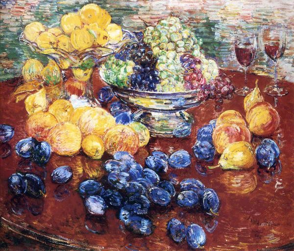 Editor: Here we have Maurice Prendergast's "Fruit and Flowers," painted in 1913 using oil on canvas. It strikes me as surprisingly vibrant, even audacious in its colour palette, especially for a still life. What compositional elements stand out to you? Curator: The composition certainly relies on an interesting tension between order and chaos. Note how Prendergast uses a relatively shallow picture plane, pushing all the elements – the fruit, the flowers, the wine bottle – forward. The thick impasto technique further flattens the space, emphasizing the materiality of the paint itself. Editor: So, the texture is key. What about the arrangement itself? The objects seem carefully placed, but almost haphazardly so. Curator: Precisely. Observe the repetition of circular forms—the fruit, the flower pots, the plate—and how this rhythm is counterpointed by the vertical thrust of the wine bottle and the varied heights of the flowers. There's a structured asymmetry at play. Also, let’s look at the artist's brushstrokes - broken and seemingly unstructured; this adds an undeniable visual richness. The overall surface functions as a mosaic of colour, where distinct brushstrokes coalesce. Editor: It's as if the subject matter is less important than the exploration of colour and texture, and how forms interact. Curator: Precisely! The work encourages us to move past a representational reading and consider its purely visual qualities, such as how the mosaic creates its particular dynamic unity and pleasure for the viewer. What would you add? Editor: I see now the genius in letting the forms arise out of this chaos. Thank you for opening my eyes. Curator: And thank you, that's a different way to interpret than how I saw it before we talked!