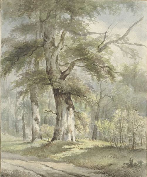 Editor: So, this is Carl Spitzweg’s "Baumstudie," likely created between 1831 and 1835. It seems to be watercolor and possibly other media to me, judging by the impasto. I'm immediately struck by its tranquil, almost idyllic feel. What stands out to you when you look at this piece? Curator: Well, considering the sociopolitical climate of the 1830s, with rising nationalism and social unrest across Europe, this apparently simple study of trees takes on a deeper resonance. Spitzweg wasn't just painting trees; he was arguably creating a visual language of national identity. Consider, for example, the way nature was used to solidify the connection between a people and a place. Do you see that connection being built here? Editor: I can see that. The Romantic style emphasizes a kind of idealized view of nature that could definitely be used to promote a sense of national pride or unity. But beyond the historical context, what about the formal elements? Curator: Exactly. Think about how Spitzweg uses plein-air to evoke an immediacy and authentic experience of nature. The impasto technique adds another layer, a tangible presence. How does that contribute to the political or social statement the artist is making? Is this realism or the artist projecting what society wishes nature could be? Editor: I see what you mean. It's not just about recording what's there; it's about carefully constructing a certain image of nature, one that reinforces specific values or beliefs, or at least proposes such a way. Curator: Precisely. By depicting an idealized, harmonious relationship between humanity and nature, artists like Spitzweg contribute to the ongoing construction of national identity and cultural values. Editor: That gives me a totally different perspective on what I initially saw as a straightforward landscape. Thanks! Curator: And thank you. Considering art as activism encourages a more comprehensive understanding of a work’s intended and unintended legacies.
