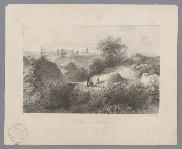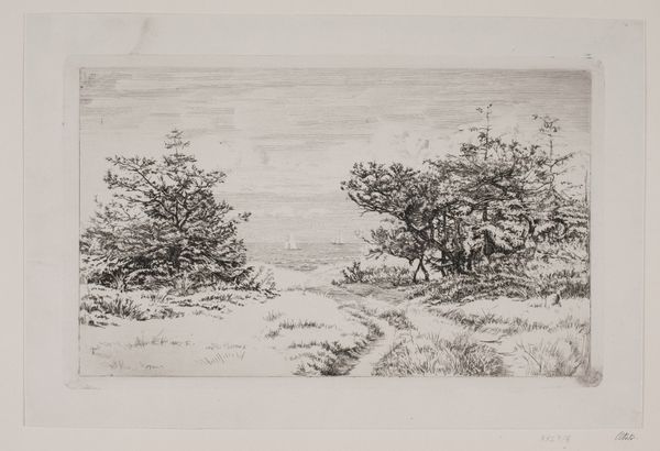 Carel Nicolaas Storm van 's-Gravesande created this etching titled 'Heidelandschap bij Worth-Rheden.' The composition pulls us into a Dutch heath landscape through subtle tonal variations and densely worked lines. Notice the stark contrast between the intricate details of the foreground vegetation and the open, expansive sky. Van 's-Gravesande uses line and texture to create a sense of depth and atmosphere. The artist balances the rough, natural forms of the landscape with the structured, geometric format of the etching itself, highlighting the tension between nature and artistic representation. Observe how the figures on the path are dwarfed by the landscape. This creates an impression of nature’s sublime power. Etchings like this helped to democratize art in the 19th century. The work embodies a romantic vision of the Dutch landscape, inviting viewers to contemplate nature's beauty through its carefully constructed lines.