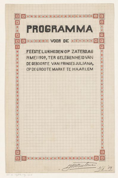 Reinier Willem Petrus de Vries made this drawing, titled 'Kader met de tekst 'Nederlandsche boekversieringen,' sometime around 1910, probably with ink and pencil on paper. It’s like a plan, carefully mapped out on a grid, showing the architecture of graphic design. What strikes me is the handmade nature of it all. The grid gives it structure, but the tiny marks around the edges feel so deliberate and crafted. Look at how each little flag has slight variations, an insistence on the mark, rather than a perfect duplication. The colours, muted reds and blacks, create a gentle rhythm, almost like musical notation. It reminds me of the work of Paul Klee, who also used grids and simple forms to explore complex ideas. Both artists seem to be interested in the intersection of order and chaos, control and spontaneity. In the end, it's all about possibilities.