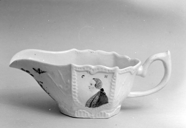 Editor: So, this lovely ceramic cup, titled simply "Cup," was crafted sometime between 1750 and 1760 by the Derby Porcelain Manufactory. The delicate floral design is quite striking, yet subdued in grayscale. How would you interpret its significance within its historical context? Curator: It's fascinating how a simple object like a cup can reflect larger societal trends. Porcelain production in the 18th century was a highly competitive industry, deeply embedded in the politics of trade and national identity. Factories like Derby, as a British manufacturer, actively sought to capture markets dominated by Chinese and other European producers, but that came later with different materials like bone china, don't you think? Editor: It seems that the decoration on the cup are transferred prints. I know very little about that technique. Curator: Exactly, the use of print demonstrates an important aspect of the manufactory: mass production to bring fashionable, luxury items to a broader segment of society. Decoration through printed design meant reducing the number of specialized, highly-paid painters on staff. That said, how do you think this impacted public perceptions of art and craftsmanship at the time? Editor: Well, on one hand, maybe it democratized access to beautiful objects, but perhaps it also devalued the artist's hand, shifting value from artisan skill to broader consumer appeal. Curator: Precisely. What seems a simple, charming design speaks to tensions between artistic integrity, mass production, consumer culture, and also, this Rococo obsession with nature and beauty. This also says something about museums preserving utilitarian items from earlier eras, as beautiful yet somewhat mundane objects for study and appreciation. Editor: I never considered how much history could be packed into a teacup! This was incredibly enlightening! Curator: Absolutely. Everyday objects often provide the most intimate glimpses into the lives, values, and the cultural landscapes of the past. It enriches one's view on artistic endeavors as culturally grounded activities.