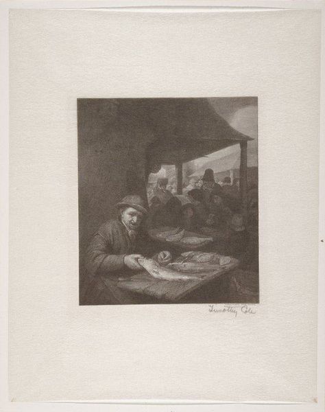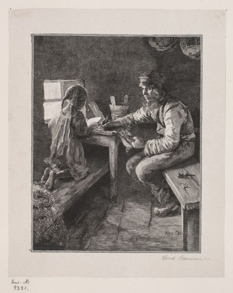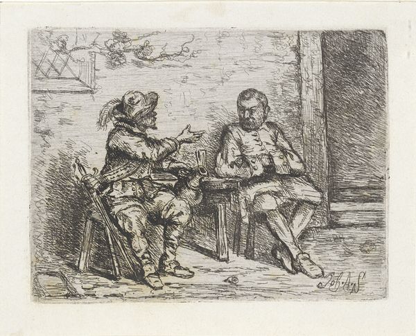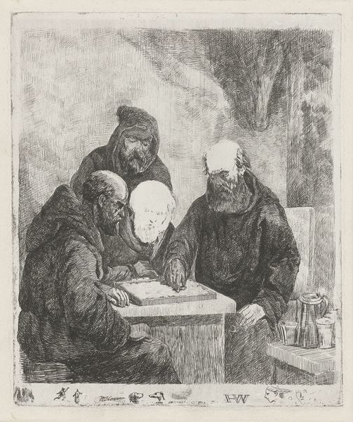 Willem Pieter Hoevenaar created this etching titled "Dammende monniken" whose date is unknown. It translates to "damning monks" or "checkers playing monks". The artist lived through a time of significant social upheaval, witnessing the decline of traditional power structures and the rise of new social orders. This etching invites us to consider how institutions like the clergy navigated periods of change. The setting is intimate, a closed-door scene, where three monks are intently focused on a game of checkers. It subtly questions the traditional image of monastic life, hinting at the personal and perhaps less pious interactions within the cloister. We might wonder about the expressions on their faces. Are we seeing simple camaraderie, or is there a deeper commentary on power dynamics and moral ambiguities within religious institutions? The very act of monks engaging in a game of checkers—a leisurely pursuit—challenges our expectations. It blurs the lines between the sacred and the secular. As you reflect on this piece, consider the stories it tells about identity, faith, and the human condition. What does it mean to see figures of authority in such a candid, unguarded moment?