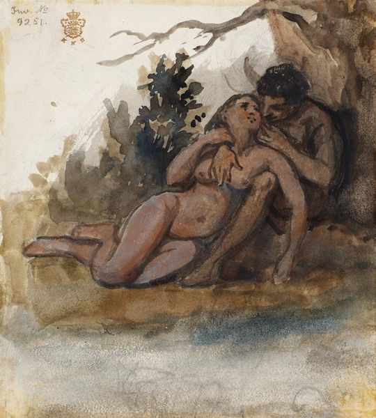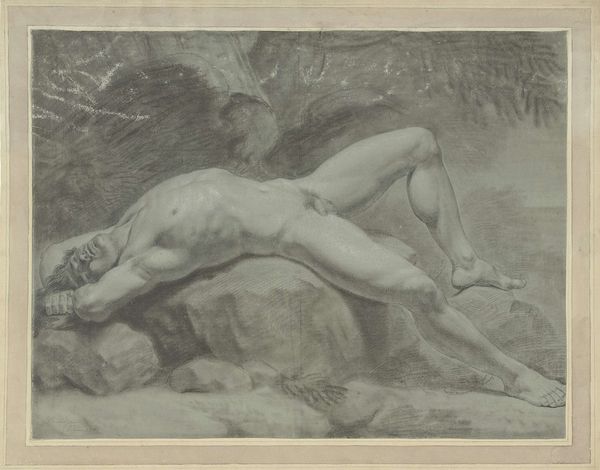 Curator: I find this charcoal drawing immediately captivating. Koloman Moser created "Reproduction template for the leaf for Gerlach's love allegories. New Series, Plate 35" in 1895. It has the aura of Art Nouveau symbolism. Editor: It’s rather striking, isn't it? The material of charcoal lends itself to a sort of raw delicacy. Considering it was a reproduction template, there’s something industrious implied beneath the dreamy imagery, right? Curator: The composition directs our eyes explicitly—we have the clear division between the woman, classically nude, resting at the base of the image, and the satyr above and behind. Note Moser’s careful delineation, the way the bodies are highlighted against a deliberately indistinct landscape. Editor: Undistinct is generous. We are given such little information to actually locate or contextualize this scene beyond a rudimentary landscape. Look at the economy of mark-making. Charcoal allows Moser to imply textures—flesh, fur, cloth—through varied pressure and smudging. He seems almost workmanlike! Do we have insights into how the piece relates to others in the New Series? Curator: What fascinates me is Moser's adept use of contour and tonal variation, especially regarding allegorical weight. Consider how he renders form, focusing on idealized proportions. The nude figure, the positioning of her limbs, all emphasize an understanding of the figure while imbuing a sense of timelessness. Editor: The timelessness, I would suggest, has everything to do with the *use* of the materials. How he gets the absolute *most* out of it, achieving the sort of detail that one could mistake it as silverpoint, while maintaining its accessibility as a reproductive drawing! Curator: I appreciate how you bring that into focus—and how this tension between the reproducible and unique strengthens the artwork's complex structure. Editor: Yes, seeing the ways art is work, and labor makes a sort of beauty, enriches my experience. Thank you.