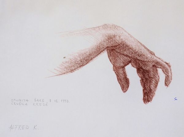 Alfred Freddy Krupa made this study of an arm and hand in 1993 using crayon on paper. There's something about the hatching marks here that really grabs me, it's all about the process. You can feel the artist trying to capture the form. The texture is important here, the way the crayon is applied. It’s not about hiding the process, it’s about the making of it. I like to think about how each mark is an individual decision, a small movement, yet, together they create a whole. Look at the elbow. See how the artist has built up the layers to create depth and shadow? That’s where the arm really pops for me, right there. It reminds me of some of the old masters’ drawings, like Michelangelo, but with a contemporary feel. For me, art is always a conversation across time. It’s never really about fixed meanings, right? It's about the ongoing exchange of ideas, experiments, and different ways of seeing.