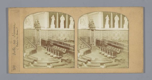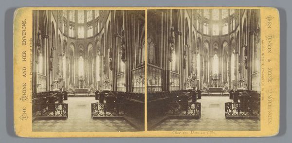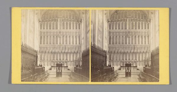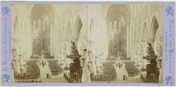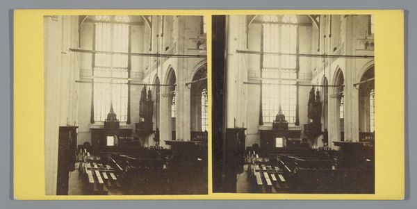 Editor: This photograph, "Gezicht op het interieur van de Nieuwe Kerk in Amsterdam," taken between 1860 and 1885 by Pieter Oosterhuis, presents the church's interior. It's amazing how the artist was able to make this gelatine print give a real sense of monumentality and reverence, especially with all of that visible detail. How do you read this particular shot? Curator: It invites introspection, doesn’t it? It feels deeply personal despite its scale. For me, it whispers of time. The grandeur, caught in monochrome, reminds me that these stones have witnessed centuries unfold. Does the photograph’s stillness capture a certain spirit for you? A breath held within history, perhaps? Editor: It does. Especially considering the organ is in the background - it feels like everything is still before the music starts. Curator: Precisely. Imagine the stories those walls could tell, not just of sermons and ceremonies, but of countless personal moments. That to me, is the magic of places of worship captured in art like this. Now tell me, where does *your* eye travel first in this composition? Does your gaze get drawn to any one element in particular? Editor: I think it is the symmetry, but I also think it may also be an illusion created by the printing process and format. Curator: Ah, good eye! The allure of symmetry can indeed be deceptive. But there is definitely order there and certainly a beauty to it. Now, having had a closer look together, does it still feel like you were the first time? Editor: It definitely feels a lot less empty, I'd say. There is definitely some interesting storytelling to be had in a shot like this one, and now I know where to look!
