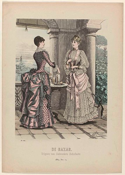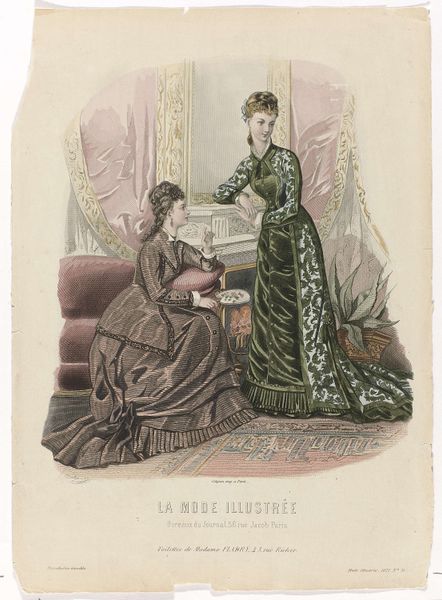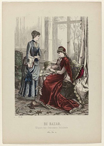 Curator: It strikes me as an illustration of very constrained leisure. All artifice and propriety, wouldn't you agree? Editor: Before us we have the print “De Bazar, 1882, Nr. 2, Pl. 490,” attributed to an anonymous artist from 1882. My eye goes immediately to the shimmering textiles of the gowns and their intricate patterns. It's quite captivating. Curator: Absolutely! This work provides a portal into the cultural rituals surrounding domesticity, consumption, and the subtle codes of femininity of the era. That doll for example could signify arrested development in the girl's psyche. Editor: Fascinating! But also, consider the printing process itself. Here, it looks like color lithography, allowing for mass production and dissemination. The rising consumer culture democratizing fashion on printed pages, think of the factory production behind those textiles! Curator: Yes, exactly! Mass media, then, is shaping societal values of beauty and desire. Consider the symbolism of the dresses themselves. Stripes, for example, could carry myriad social messages. Editor: True. How are those dresses assembled? What labor was involved, what are their fibers, dyes? Curator: Those colours would be imbued with particular connotations that shift through generations too, reflecting changing notions of morality, beauty and class. The dresses can also serve as containers for women's hopes and dreams, both restricting and enabling at once. The "cage" of a garment. Editor: So you see dress as a sort of second skin… What about the role that clothing plays as an commodity within industrial economy. How many dresses of this period were ready-to-wear instead of being bespoke? Curator: Hmmm... In short, by understanding symbols, like those displayed on this particular garment, and their role in psychological landscapes, we grasp the threads linking us to both our personal and shared cultural past. Editor: A reminder that aesthetics are rarely detached from their making; this piece demonstrates a tension between personal meaning and a broad system of production. Curator: Indeed. Both deeply intertwined as is everything of worth.