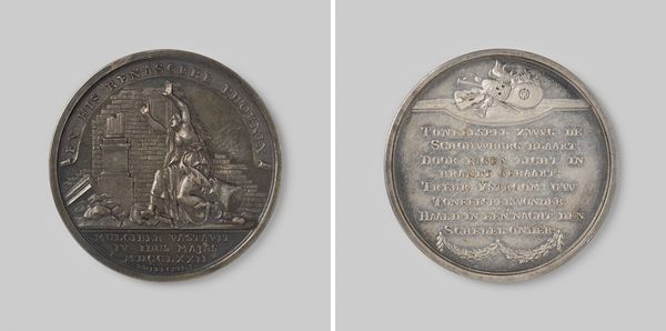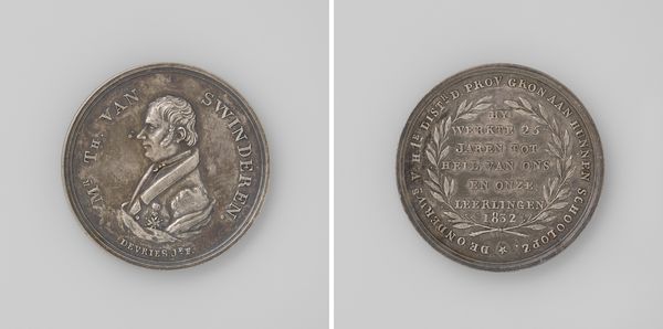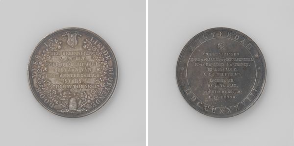 Curator: Here we have a metal relief print titled "Bevestiging en reorganisatie der Belgische gerechtshoven en rechtbanken" – loosely translated, it addresses the confirmation and reorganization of Belgian courts and tribunals. The artist is Adrien Hippolyte Veyrat, and the piece likely dates back to 1830. Editor: The cool, silvery metal and the geometric precision of the lines create an immediate sense of stark authority. There is very little relief on this print. What statements might the work offer? Curator: From a formal perspective, the symbolism is rather clear: the scales of justice are prominent, flanked by fasces, and all overseen by a sword pointed upwards, suggesting authority and vigilance. It’s all very neatly composed within the circular frame, isn’t it? Note, also, the inscription circling the top edges on either side of the work. Editor: The piece emphasizes the tangible tools and authority. We must consider how Veyrat might approach engraving onto metal. This requires immense precision and strength of labor. What social context can the work bring us into? Curator: Certainly. The neoclassical style speaks to the rational ideals of the time and the theme nods to the very recent history of Belgium as it confirmed courts after becoming independent of the Netherlands in 1830. Editor: It is indeed curious how Veyrat seems to portray lawmaking more through the work it generates through metal, tools, and hands than a broader sentiment of justice, history or fairness. Curator: The arrangement seems intentionally created and symmetrical as we see that tools are in line. Veyrat perhaps wishes to portray it as all is, ultimately, just and true. It all brings it back to authority, law and geometric truth, but does the material give some insight, too? Editor: Perhaps in emphasizing labor as it applies to justice. It may represent justice and social labor as a type of practice done not only by the minds of man but by his labor and hand. I had not looked at it from that vantage, but I’m inclined to now!