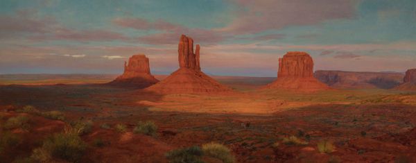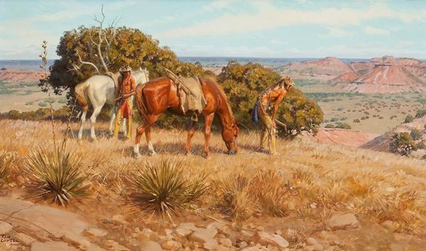 Editor: Maynard Dixon's "Wide Lands of the Navajo," painted in 1945 using oil paints in a plein-air style, really evokes the vastness of the American West. What initially strikes me is the stark contrast between the enormous, almost cartoonish, clouds and the more muted earth tones of the landscape. How do you interpret this work, especially the use of those contrasting elements? Curator: The landscape itself holds a particular power within the Navajo cultural memory. Do you see how the imposing rock formations seem to mirror the solidity and resilience of the Navajo people? Editor: I see that, definitely. They are permanent. Curator: Dixon uses the horse as a symbol of freedom and untamed spirit. Note how the line of horses stretches into the distance; It also is not an accident to view the distant blue as both dreamscape and reality. Consider also how light interacts with the rocks in the distance; there is a sense of time that emanates and asks questions about perception and truth. Editor: So the land and the horse evoke cultural symbols...I had not picked up on how the interplay of light and the clouds could give this feeling of suspended reality. Curator: Indeed. In terms of cultural memory, clouds often represent the divine or unseen forces, and the sky can indicate either peace or storms. And here Dixon renders the clouds with weight, suggesting the land’s precious source of rain – all elements vitally intertwined. Do these associations amplify or change how you view the landscape now? Editor: It certainly gives a greater depth to what I initially saw as a fairly straightforward depiction of the West. I understand the artist wanted us to reflect on how interconnected it all is, not just look at pretty horses running by. Curator: It’s about continuity, how landscape, culture, and spirit are woven together through symbols understood and felt across generations. Editor: Right, it's a far deeper exploration of culture. Thank you, it really opened my eyes.