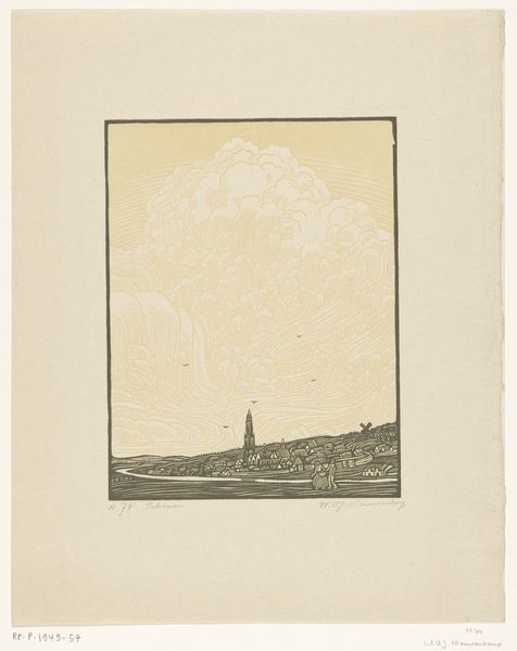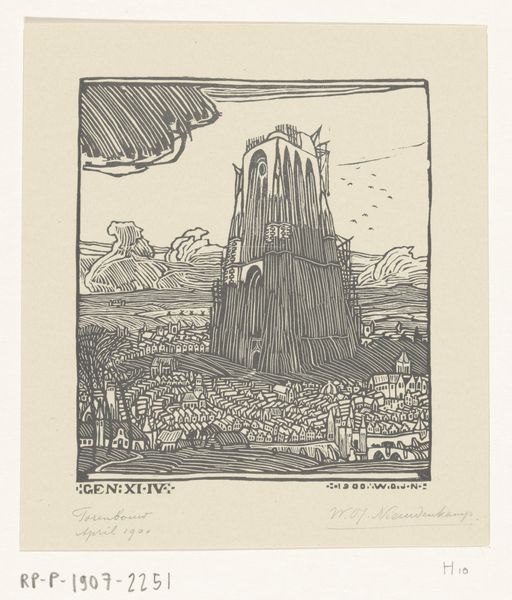 Editor: This is "Cities Under a Cedar in a Mountainous Landscape" by Wijnand Otto Jan Nieuwenkamp, a woodcut print made sometime between 1900 and 1905. It has a kind of fantastical, almost allegorical quality. What strikes me is the strange inversion of nature – the tree feels more substantial than the settlements beneath it. What do you see in this piece? Curator: It’s interesting you pick up on that inverted hierarchy. Given the time it was created, in an era of increasing industrialization and urbanization, this woodcut could be seen as a commentary on humanity's relationship with nature. Notice how the cedar tree, deeply rooted, almost seems to cradle or perhaps even *threaten* the settlements. How might we interpret that juxtaposition? Editor: Threaten? I was thinking protect, like it was nurturing the city under its branches. Curator: I can see that perspective. But let’s consider the inscription from Ezekiel. In that biblical passage, the cedar tree is a metaphor for power and pride that is ultimately felled. The image raises the question, does this nurturing imply a controlling dominance? Consider also, what narratives might be silenced or marginalized when we romanticize a vision of the natural world? Editor: So, the print might not just be a pretty landscape; it could be critiquing power dynamics or warning against unchecked human ambition and its impact on the environment? Curator: Precisely. Nieuwenkamp places us in a position to question those dynamics and our place within the natural world. It asks us to consider the ethics of our interaction with the environment. Editor: Wow, I didn’t expect to go that deep. I just thought it was a nice picture of a tree! Curator: Art has a wonderful way of surprising us.