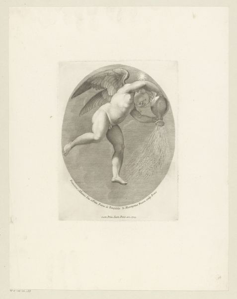 This is Johann Leonhard Raab's monochromatic print, "Martyrdom of St. Andrew". The composition immediately draws you in with the stark contrast between light and shadow, a technique known as chiaroscuro, which creates a dramatic and emotionally charged scene. Raab masterfully uses diagonal lines to disrupt any sense of stability. Note the cross, which dominates the upper portion of the scene, leaning precariously. This destabilization unsettles the viewer, mirroring the turmoil of the martyrdom itself. The artist uses the cross as a structural element, but also as a semiotic device, representing sacrifice and spiritual transcendence. The image's structure encourages us to reflect on the nature of faith and suffering. Raab challenges traditional representations of religious events. The stark contrast and dynamic composition refuse to allow the viewer a comfortable, passive observation. This piece invites ongoing interpretations as the relationship between form and content remains a potent site of meaning-making.