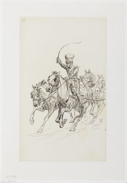 Curator: Well, isn't this evocative! I am instantly reminded of childhood toy soldiers. There’s a quirky charm, an almost playful quality despite the serious subject matter. Editor: The "Grenadiers van de Keizerlijke Garde met trommelaars," or Grenadiers of the Imperial Guard with Drummers, made with pencil, pen, and ink by Willem Constantijn Staring in the late 19th or early 20th century gives us a window into genre-painting and military representation. Curator: Oh, the clash! This drawing really confronts how we engage with displays of power. Think about it: the grand uniforms, the rigid formation. And yet, captured in delicate lines, they are almost rendered harmless. How fascinating. Editor: It's intriguing to consider the context. Staring was working in a period of significant social upheaval across Europe. The rise of nationalism and industrialization heavily impacted views of both the military and representation. This could be interpreted as a reflection on the pomp and circumstance of military power versus the human cost of conflict. Curator: Exactly! And let’s consider the almost obsessive detail in the Grenadiers' headwear versus the rather simplified rendering of their bodies. Are we meant to focus on the trappings of power and status? I sense a subtle critique of superficial displays of strength. Editor: Absolutely. Furthermore, the academic art and realism shown may well challenge viewers to contemplate their relationship with authority and order. The composition implies a narrative about discipline and spectacle but I feel the human figures give these characters the real value of storytelling in social observation. Curator: It is precisely this tension between realism and the suggestion of satire that makes the piece so compelling. It invites us to question not only the representation of military might but the values that underpin it. The power is there. But what does the artist think? It certainly holds water. Editor: Yes, what seemed straightforward on the surface proves to have a nuanced and complex dialogue about its place in visual culture. The echoes of history are quite present but also their impact to contemporary theory today is clear. Curator: Definitely one to stay with me for a while, I love the initial simplicity of it all. The history really helps it find context to what can be at first lost. Editor: Indeed, the artistic decisions spark vital questions regarding society, class, gender, and so on. Art is truly amazing when you can add your own lived experiences and learn from that!