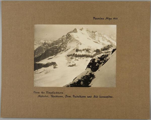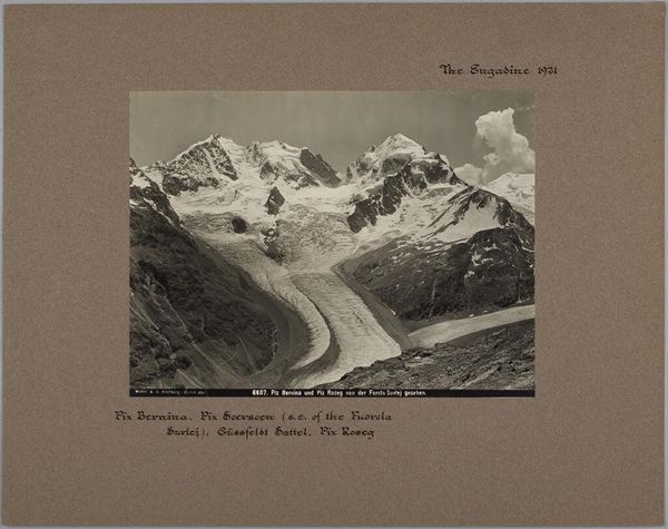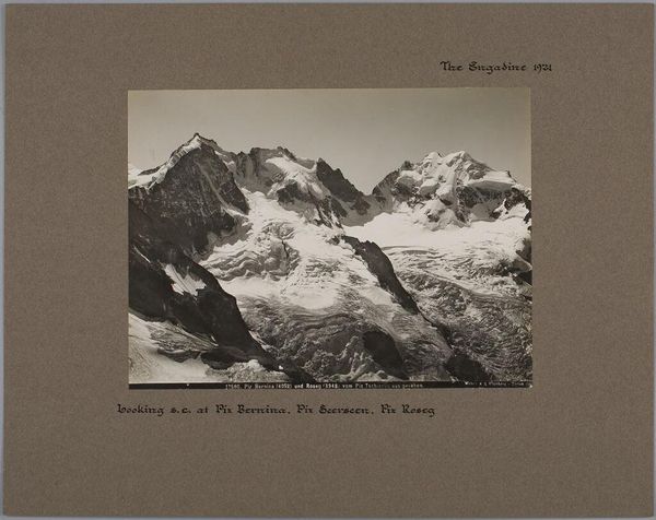 Curator: This photograph by A.G. Wehrli, simply titled "Piz Roseg, Bellavista, Crastagüzza, Piz Zupo, Piz Argient, The Engadine," captures a formidable mountain range. Editor: It feels monumental, doesn’t it? The stark monochrome and dramatic peaks evoke a sense of sublime power, and even a little danger. Curator: Mountain landscapes often carry symbolic weight. The peaks reaching for the heavens, representing aspiration, while the glacial expanse could signify the passage of time. Editor: And the cultural fascination with conquering these landscapes. Mountain photography, at this time, was often tied to notions of exploration and national identity, promoting a certain vision of Swiss strength and resilience. Curator: A visual language deeply embedded in the popular imagination, continuing to this day. Editor: The image certainly speaks volumes about our ongoing relationship with the natural world.
