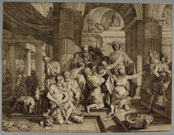 Rembrandt van Rijn created this print, "Christ before Pilate," using etching and drypoint, a process of incising lines into a metal plate. The matrix is copper, which Rembrandt would have sourced from mines in Sweden or Hungary. The image is made by covering the plate with an acid-resistant ground, then scratching away the lines of the composition. The plate is then immersed in acid, which bites into the exposed metal. For the drypoint lines, Rembrandt would have used a sharp needle to directly score the plate, creating a burr – a ridge of metal – which holds additional ink, resulting in a velvety, dark line. This material quality is visible most clearly in the deep shadows and textures of the fabrics. Rembrandt was a master of these printmaking techniques, pushing their expressive possibilities. Through the skilled application of labor, he elevated a relatively commonplace medium to the status of high art. In doing so, he collapses traditional distinctions between craft and fine art.