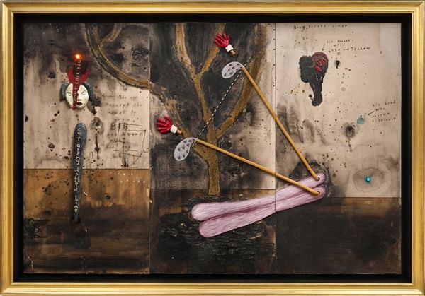 Curator: Let's turn our attention to Arthur Tress's striking assemblage, "The Boys from Krakow," created in 1984. Editor: It has a decidedly dystopian feel. The rusted tools, the grime, the strange little figures... It’s chaotic, yet intensely controlled. There’s a powerful tension at play in the overall composition. Curator: Precisely. Tress, known for his staged photography, blends sculpture, found objects, and photography in this piece, pushing against traditional boundaries. Notice the carefully considered arrangement. The textures, the juxtaposition of materials—metal, string, debris—it all contributes to a complex visual language. The formal relationship is paramount here; everything is so balanced that it makes you wonder whether you are looking at two dimensions or three. Editor: The 'boys' themselves, suspended in what look like makeshift cages with red string. Cages, webs...they evoke feelings of entrapment, maybe even childhood nightmares. And Krakow...given the historical context, is he hinting at the Holocaust and lost innocence? Curator: That interpretation holds significant weight, absolutely. The symbolic implications are deeply rooted in cultural memory. However, I believe the impact also relies on the sheer visual impact. The stark contrast between the soft light, casting long shadows, and the harsh, industrial elements is so important for creating affect and communicating certain ideas. Editor: So the objects themselves aren't simply aesthetic choices? That dangling light fixture, for example, casts a sense of harshness, the rakes have very rigid patterns of straight lines, like implements of some rough game or maybe weapons. Curator: Correct. Each component resonates both aesthetically and metaphorically. Tress doesn't provide easy answers; instead, he presents a potent visual puzzle which opens possibilities for a wider dialogue about post-modernity as a response to historicity. Editor: A somber, thought-provoking reflection indeed. Thank you for clarifying those nuances. Curator: And thank you for illuminating those evocative connections—an enriching way to see the continuity of historical trauma!