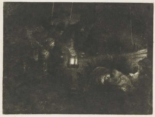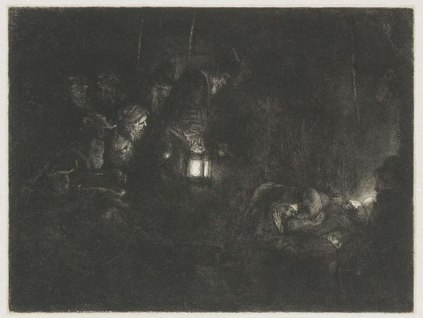 Curator: This is Rembrandt van Rijn's "Adoration of the Shepherds: A Night Piece," currently held at the Harvard Art Museums. Editor: Wow, it's like a secret whispered in the dark; it feels like a dream barely remembered. Curator: Rembrandt masterfully uses light and shadow. The lantern held by one of the shepherds is not just a source of illumination but also a symbol of divine guidance. Editor: It’s an emotional spotlight, right? Focusing on the wonder and vulnerability of the moment. Curator: Absolutely, and the etching technique allows for incredible detail, intensifying the spiritual significance. It’s a potent image of humility and faith. Editor: It makes you wonder, doesn't it? What does it mean to find light in darkness, both literally and figuratively?