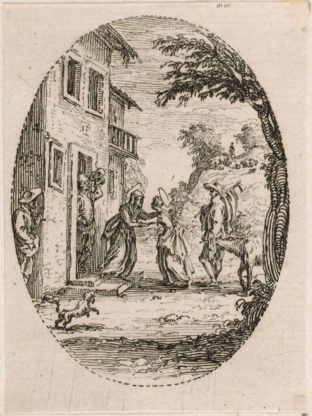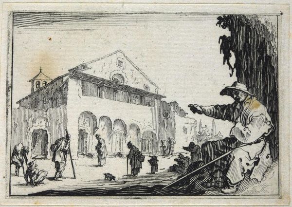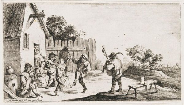 Editor: Here we have Jacques Callot’s etching, "Tavern." It's a small print, but the detail is incredible! There is a lot happening in this image and so many characters. What strikes you about this work? Curator: For me, it’s about the production of this scene. Consider the copperplate, the labour involved in etching those fine lines, and the accessibility this offered to a wider audience. What narrative of material consumption does this tavern scene imply? Editor: That's a good point. I hadn't thought about the tavern as a site of early consumption. What do you make of that? Curator: Well, the printmaking process itself democratizes art, making it a commodity. Similarly, taverns served as places where different social classes could meet and spend their money, revealing social mobility and economic exchange. What do you think? Editor: I never really thought of it that way. It's fascinating to think about a tavern scene in terms of production and consumption.