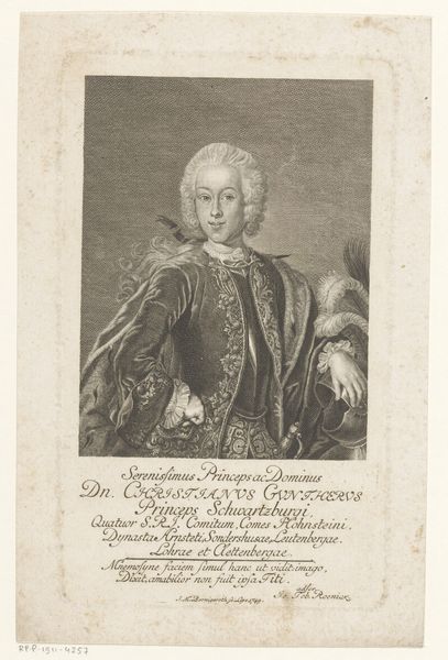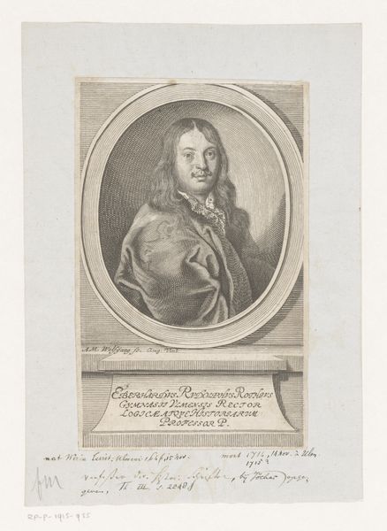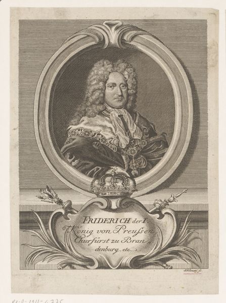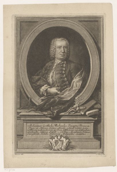 This is a portrait of Joseph Anton von Protreis, made by Joseph Anton Zimmermann. The image presents a man in elaborate dress, framed by ornate decorations and heraldic symbols. Notice how the portrait is framed—not just by lines, but by a constructed reality of power and status. The elaborate frame itself, adorned with baroque flourishes, speaks to the subject's elevated position in society. It's almost as if the frame is an extension of the subject's personal aura. Now, consider the heraldic shield at the base. Crests and shields are not merely decorative; they are a visual language, encoding family history, allegiances, and personal virtues. They harken back to medieval traditions, where such symbols were crucial for identification and the assertion of lineage. This visual language continues to resonate, stirring something primal in our subconscious. The persistence of such symbols—the frame, the crest—reveals our deep-seated need to contextualize ourselves within a narrative, to anchor ourselves to something enduring. We continue to see these images resurface across history, reinventing themselves in new contexts, bearing testament to culture.