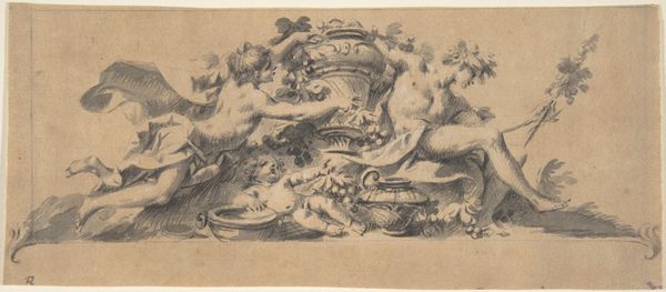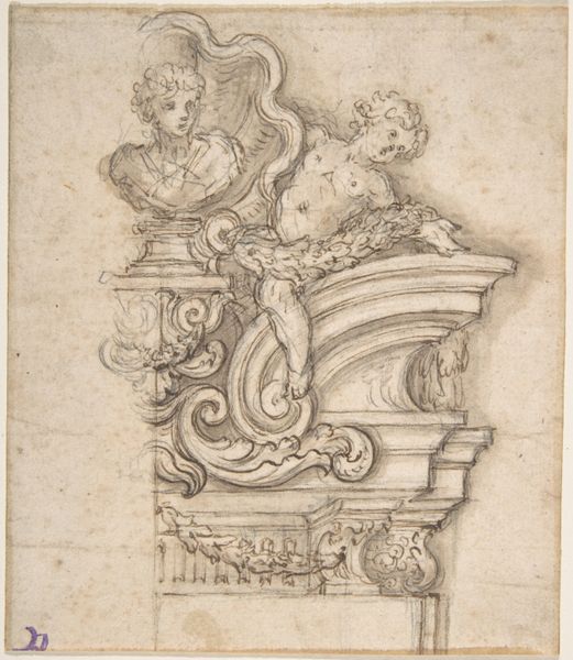 This pen and brown ink drawing depicts a design with a cartouche, made by an anonymous artist. Cartouches like this one were popular in Europe as decorative frames for inscriptions, coats of arms, or portraits. Here, we see the cartouche flanked by cherubic figures, one with wings, the other seated atop a classical column fragment. Architectural elements, such as the column and the suggestion of an arch above, indicate a concern with the proper ornamentation of buildings, likely somewhere in Europe. Though undated, its style and subject suggests this drawing probably comes from the 17th or 18th century, a time when the social status of patrons and institutions was often enhanced through elaborate architectural projects. We might consider the institutional context for which this design was intended. Was it for a church, a palace, or some other public building? Answering that question requires further research into the visual codes and the history of ornament. The interpretation of art is always contingent on the social and institutional context in which it was made.