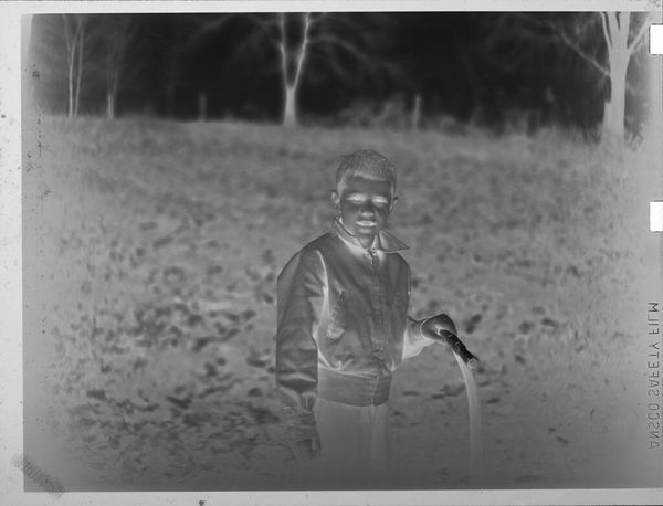 Curator: This small, untitled silver gelatin print by Lucian and Mary Brown shows a boy building a model ship outside. Editor: The immediate impression is dreamlike, almost a ghostly image. The inverted tones create a stark, ethereal atmosphere. Curator: It's interesting how the image inverts the familiar. The boy becomes a figure of light against a shadowed world, emphasizing innocence and childhood. The ship itself, a vessel of exploration and perhaps escape. Editor: Yes, and the composition, with the boy centrally placed, creates a sense of balance. The flatness and limited tonal range flatten space, lending an abstract quality. There is a symbolic interplay between play and darker undercurrents. Curator: The very act of creation, of building this ship, becomes a powerful symbol. It reflects human aspiration, the urge to construct, to journey, even within the confines of childhood. Editor: The photograph, as an object, presents an interesting paradox. It’s a small, intimate piece, yet it speaks to universal themes. Curator: Indeed, the photograph preserves a moment of imaginative creation. Editor: It's a hauntingly beautiful little piece, rich in visual contrasts.