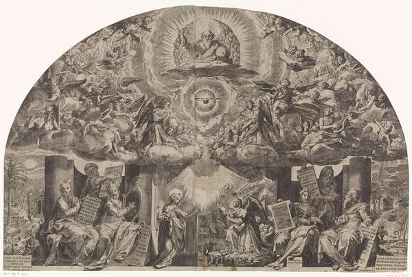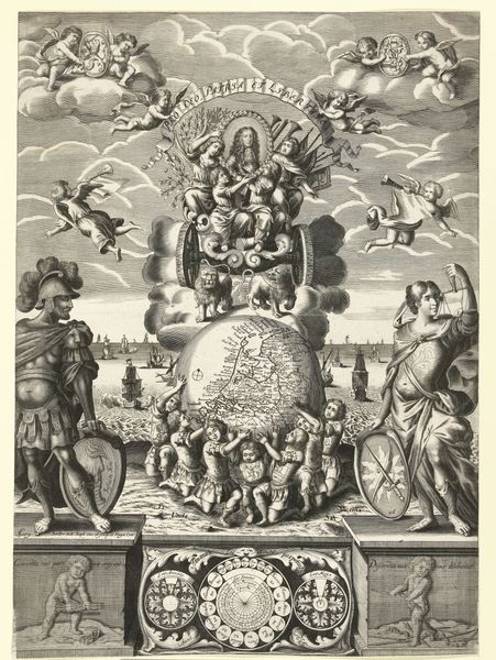 Curator: This engraving, dating back to 1719, is titled "Plate for The Fish and the Fireworks, Fable Sixteen, in Fables Nouvelles, Dediées au Roy," by Lamotte-Houdar. It currently resides here at the Metropolitan Museum of Art. What is your immediate impression? Editor: An explosive display of symbols and light. There's almost a sense of divine revelation mixed with worldly spectacle. It's busy, but in a way that draws the eye deeper and deeper. Curator: Interesting you use the word 'explosive', given fireworks play a central part in its content, both literally and metaphorically. We're looking at a print, and in terms of process, that means considering the layers of decisions that the printmaker took in mark making. Notice the meticulous work in engraving and hatching, a real labour of love and the basis of visual culture. Editor: Yes, and the fireworks, presented as geometric shapes and bursts of light, almost read like constellations or mystical signs. Their imagery evokes a deeper understanding beyond mere entertainment. Curator: And these ‘signs,’ as you called them, might relate directly to the fable it illustrates. Although on the surface simply an illustration, the history and production is interesting because books themselves are of course material things, commodities in a way. It prompts considerations about artistic intent in what otherwise looks simply celebratory. Editor: Precisely. The placement of the figures gazing at the spectacle suggests the spectacle itself has instructional value; the carefully rendered reactions become an invitation to introspection. Their presence invites a symbolic reading of our world. It serves more than to merely provide visual stimulation for the wealthy consumer. Curator: Indeed. And when considering print production at this point in time we have to reflect on accessibility and readership – where would it be sold, to whom, and under which circumstances? A seemingly celebratory artwork in fact is more a part of production and material circulation within 18th century French society. Editor: Which shifts how one views it. The initial joyful explosion evolves into thoughtful interpretation—cultural messages carried on ink and paper. Curator: Exactly. Through a critical eye into the material, and in your case an appreciation of image's complex symbolic potential, we together provide insight, beyond just observation. Editor: Precisely. What initially felt like transient entertainment morphs into an encoded story reflecting societal beliefs—revealing symbolic resonance through the means of visual artistry and craft.