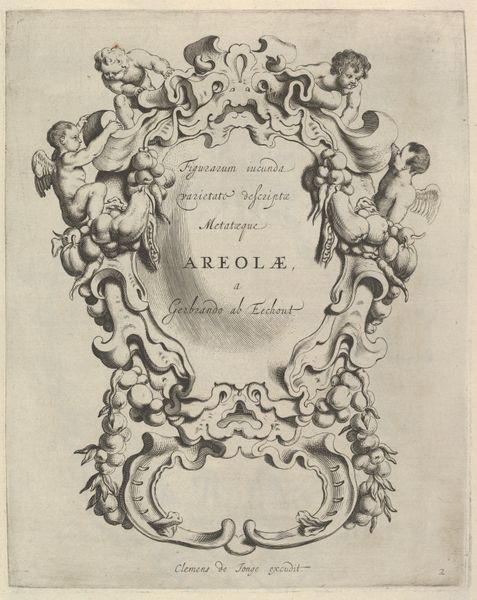 Editor: Here we have Bernard Picart’s “Titelprent voor een serie met figuren in klederdracht,” a title page from 1728, done with engraving on paper. The lettering is beautiful, and the frame has this incredible baroque ornamentation, but what really strikes me is how it seems to promise a peek into a specific time and place. What stands out to you in this print? Curator: What immediately captures my attention is the layered symbolism. Consider the title itself: "Diverses Modes." Mode isn't merely fashion; it's a reflection of cultural identity, a visual language spoken through attire. Picart is offering us, in a way, a series of cultural snapshots, and the elaborate frame emphasizes the preciousness of that cultural information. Editor: So the frame isn’t just decorative, it’s almost… protective? Curator: Precisely! The baroque style, with its flourishes and ornamentation, signals importance and value. And notice the phrase "Dessinées d'apres Nature" – drawn from nature. This suggests authenticity and an attempt to capture reality, even as it filters through the artist’s interpretation and the conventions of the time. The cultural memory being preserved is not just visual, but also philosophical, about the value placed on capturing "reality." Editor: That makes me see the piece very differently. I initially saw it as a straightforward announcement, but it’s much more nuanced than that. Curator: It is! Even the fact that Picart specifies he sells these himself, right there in Amsterdam, speaks volumes about the emerging art market and the artist's role within it. It’s a microcosm of cultural and economic exchange, all encapsulated in this small print. Editor: I see the work with fresh eyes now. It’s like a time capsule disguised as an advertisement. Thanks for pointing out how packed with information it is.