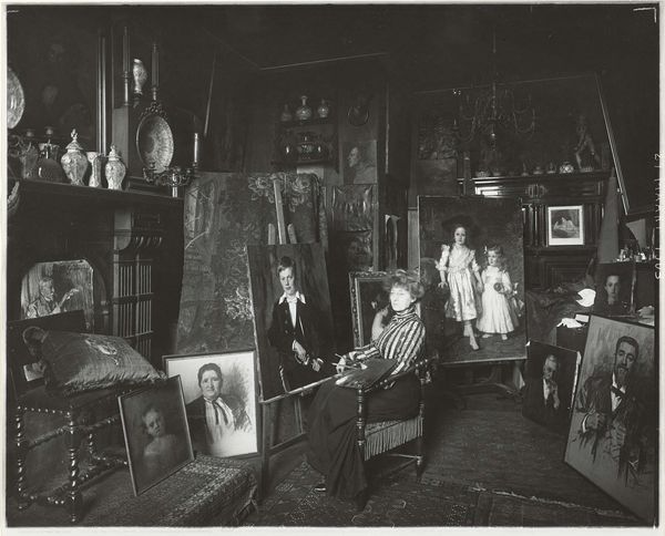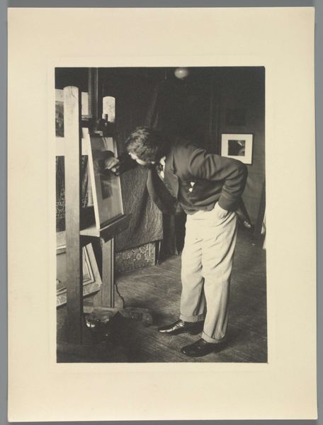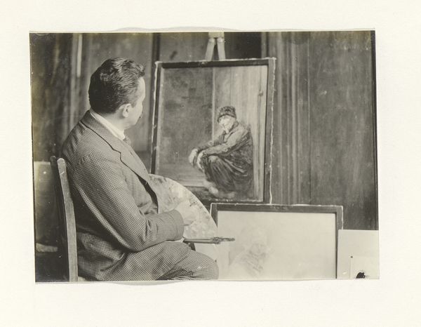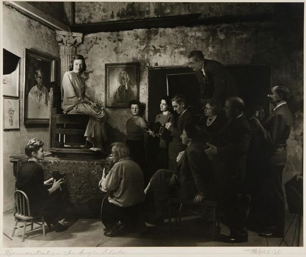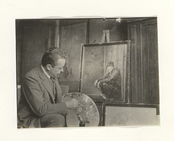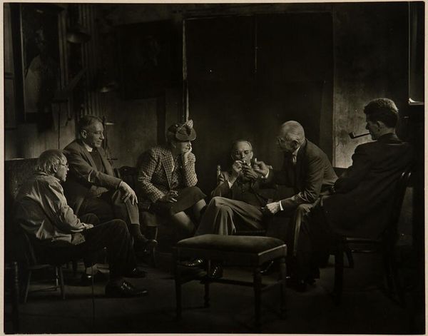 Curator: Looking at Joseph Woodson Whitesell's gelatin silver print, "Untitled (two artists conversing)," I'm immediately struck by its somber, almost melancholic, mood. Editor: And I'm intrigued by how this image reflects the artistic labor of the era. Notice the tools, the setting – everything speaks to the means of art production. Curator: Yes, the composition, with its contrasting light and shadow, guides our eye, emphasizing the dialogue and the interplay of painterly form and pictorial space. Editor: It also begs the question of what the relationship between the artists might be, and how the social dynamics between them influence their art. Curator: Perhaps we see here an echo of artistic mentorship. Editor: Or a testament to the collaborative nature of creativity. Curator: Ultimately, this image is a compelling example of Whitesell’s mastery of photographic composition. Editor: And an important historical document. It offers a fascinating glimpse into the working lives of artists and the material conditions of their time.