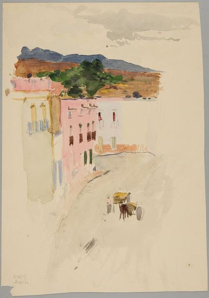 Editor: This is John Singer Sargent's "Street Scene - Cairo," housed at the Harvard Art Museums. It's an oil painting, and I’m struck by how the light seems to almost flatten the scene. What do you see in this piece? Curator: Notice how the stark white walls act as a canvas themselves, reflecting and refracting the light. Light becomes a symbol of revelation, but also of the harsh realities of life in this street. Editor: So, the light isn't just aesthetic; it has a deeper meaning? Curator: Exactly. Consider the shadows too, they obscure and conceal, creating a tension. The symbols within the image are not just what is represented, but how. Editor: That makes me see the painting in a completely different light, literally and figuratively! Curator: Indeed, art is always a cultural artifact, a reflection of memory.