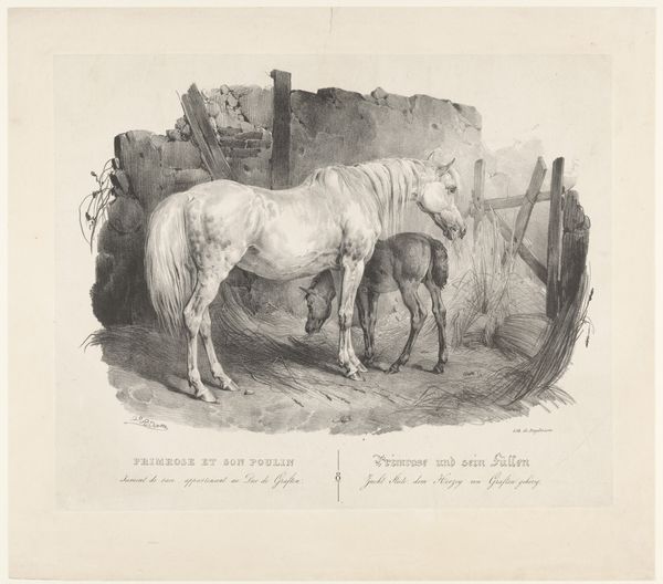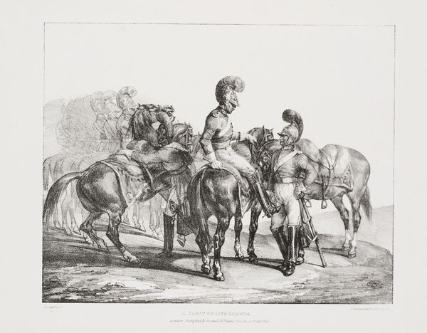 Curator: Here we have Victor Adam’s “Man met twee Turkse paarden,” a pencil drawing from 1835 currently residing here at the Rijksmuseum. It presents a rather curious scene, doesn’t it? Editor: My first thought? Elegant anxiety. Those horses seem almost mirrored but tense, ready to bolt. The rider looks like he is in two places at once, fading into the shadows. Is that sadness I see? Curator: It's certainly a portrait steeped in its historical moment. Adam's Orientalist gaze reflects 19th-century European fascination with the "exotic" East, but it also performs the social construction of identity as defined against cultural ‘others.’ We can interrogate what is presented here as a spectacle of foreignness. Editor: Absolutely! It’s like peering into a half-remembered dream. You can sense that push and pull between observation and imagination. Pencil marks dance everywhere creating that misty landscape feeling, but everything is incredibly sharp, detailed. What do you make of that ornamental frame—a trompe l’oeil effect if you will? Curator: Precisely. Framing the image in this manner further emphasizes its construction as spectacle. The artist deliberately stages a romantic encounter with another culture, inviting us, as viewers, to consider our position within this visual transaction of looking and interpreting. It reinforces European ideals of civilization compared to their conception of Turkish customs at the time. Editor: I get it. But look closer! Those edges are crumbling. Literally! It’s an invitation to look beyond—to unframe ourselves from our own presumptions and… just feel something! Those horses; powerful yet yielding... And those faded background figures: Are they coming or going? It evokes an inner migration! Curator: I appreciate how you link the aesthetic with a more personal understanding. Perhaps this intersection offers a valuable perspective for reassessing the artwork's ongoing pertinence within the historical dynamics of power relations. Editor: Yeah, I guess, because despite it all...that fellow has the quiet confidence that maybe it will all work out, and THAT resonates now. So thanks, Monsieur Adam! Curator: Thank you for illuminating the picture in this new light, giving visitors much food for thought as they experience this work for themselves.