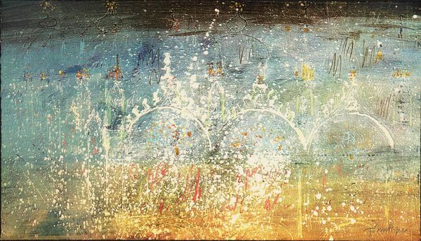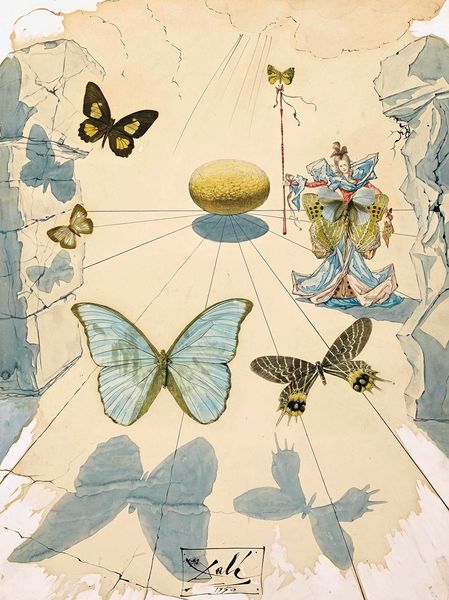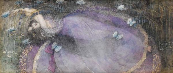 Curator: This watercolor illustration is entitled "The Fairy Circus." Its creator is Dorothy Lathrop, but we lack specifics on its date of origin. What captures your attention first about this whimsical tableau? Editor: There’s a certain hushed quality to the color palette. The jewel-like light filtering through the fairy’s wings—it feels both precious and a bit melancholic, almost like a memory. The gossamer web is like a tightrope across a dream. Curator: Lathrop was, as many female artists are, pigeonholed early on, primarily illustrating children's books. I think the designation and association are reductive, masking more nuanced commentary. Fairy tales often offered one of the sole pathways for female creatives to engage with more weighty subject matter through allegory and symbolism. Editor: Absolutely, I can see that operating here. Webs and precarious tightropes inherently invoke fragility, uncertainty, a threat. And fairies, though often portrayed as whimsical, are ambivalent figures across cultural traditions; tricksters. What readings do these symbols suggest for you? Curator: The dominant motif is precarious balance. Is the fairy dancing or struggling on that thread? This can easily be interpreted as a statement on the constraints placed on women—expected to perform an impossible balancing act in order to be seen and valued in society. And it seems to also nod toward the societal pressure placed on artists to create light, palatable content rather than more meaningful work. Editor: And the orb-like lights in the background—do they represent watchful eyes, or perhaps spotlights on a stage, increasing the performative stakes for our fairy performer? There is the question: Who are these creatures for? The artist? For the gaze of other fairies? Humans? Curator: I agree. The performative aspect cannot be overlooked. These elements invite an intersectional critique, as does this watercolor bleed; it reads to me as representing the inherent precariousness of identity in a complex world. There is also the fact of her slightness...of fairies being figures whose visual representations are easily overwritten in dominant cultural memory. The artist captures this phenomenon here. Editor: Well, Lathrop certainly imbued "children's illustration" with considerable depth, layering recognizable symbols with ambiguity and prompting complex consideration. I see "The Fairy Circus" in an entirely new light now. Curator: Agreed. These subtleties remind us that even apparently innocent fantasy worlds often subtly echo much larger sociopolitical conversations.