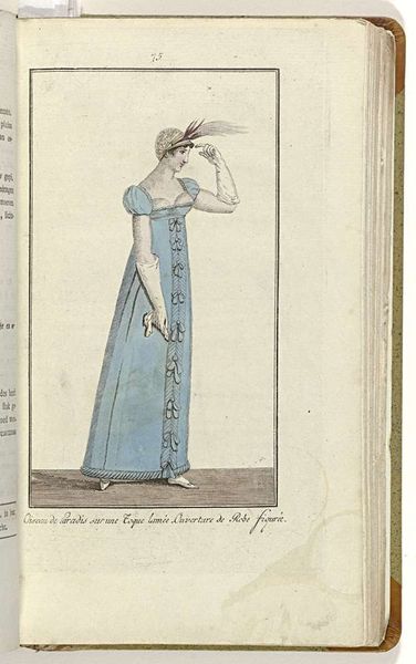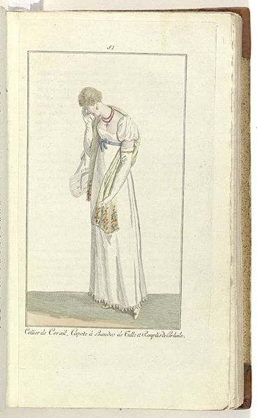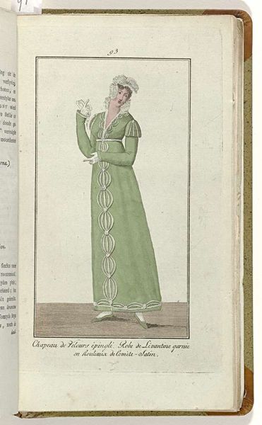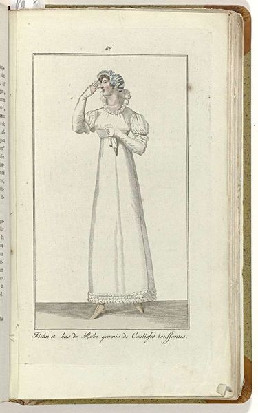 Curator: The delicacy of this piece really stands out. This is an engraving from 1809 titled "Elegantia, of tijdschrift van mode, luxe en smaak voor dames, Mei 1809, No. 76 : Costume de Lonchamp..." It’s an illustration from a fashion magazine, currently held in the Rijksmuseum. Editor: Immediately, I’m struck by how constrained and almost ghostly she appears. The whiteness of the dress against that pale background emphasizes a sense of enforced purity and the limitations placed on women of the time. Curator: The image provides a wealth of information regarding early 19th-century fashion. The high waistline, the delicate muslin, even the specific style of bonnet—these all tell a story about social status and cultural ideals through symbolic representation of this woman. The dress itself carries so much symbolic weight, representing luxury and refinement. Editor: Exactly! And isn’t that the core issue? Luxury and refinement built on social hierarchies and the suppression of women’s identities. We see her presented as an object of aesthetic appreciation, reinforcing the societal expectation for women to be visually pleasing above all else. Consider how the lack of colour further flattens her as an individual. Curator: But within the confines of those expectations, there’s a performative element at play too. The gesture of her hand, the tilt of her head – they speak to a conscious presentation of self within the accepted norms. Fashion has always provided opportunity, for signaling status, beliefs, sometimes rebellion. Editor: I concede there may be some room for negotiation. But it doesn’t absolve the structures of power inherent in such a limited visual vocabulary, she’s pointing in the way someone should look like at that time. Whose gaze is she responding to, perpetuating? It demands further scrutiny into how societal structures are embodied. Curator: A valid point, certainly, the power dynamics woven into the very fabric are there, hard to avoid for an art historian. This image acts as a potent marker, reminding us of how cultural values find expression, how images convey encoded messages. Editor: Absolutely, interrogating these artifacts allows us to understand not only historical trends but also to confront ongoing conversations surrounding power, identity, and representation, still crucial for us in today’s society.