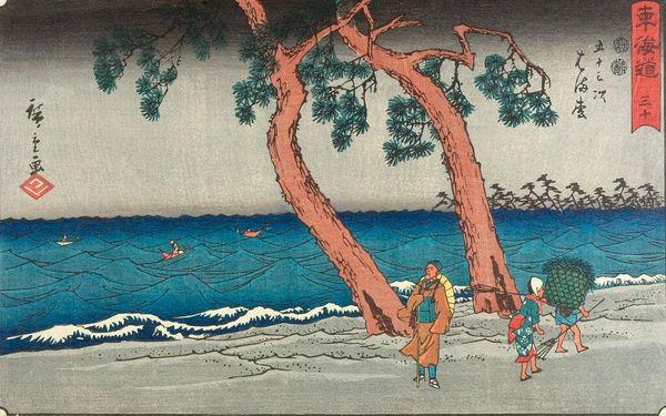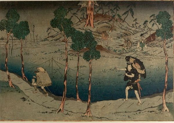 Editor: This is "Landscape" by Utagawa Hiroshige. It's held at the Harvard Art Museums, though we don't have a date listed. It feels like a snapshot of everyday life. What do you see in terms of the production and its cultural value? Curator: I'm immediately drawn to the woodblock printing process. Consider the labor involved in carving those blocks, the specific papers used, the pigments carefully applied, and how these materials contribute to the final product. Also, think about how it speaks to the availability of art to the masses via prints like these. Editor: So, it's less about the scene itself and more about how it was made, and who could access it? Curator: Exactly. It blurs the lines between "high art" and a more accessible, consumable product reflecting labor and materials in 19th century Japan. Has your view changed at all? Editor: Definitely. I hadn't considered the economic and social aspects of its production before. Curator: Understanding the materiality opens up a whole new way of appreciating the piece.